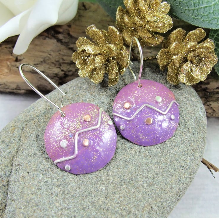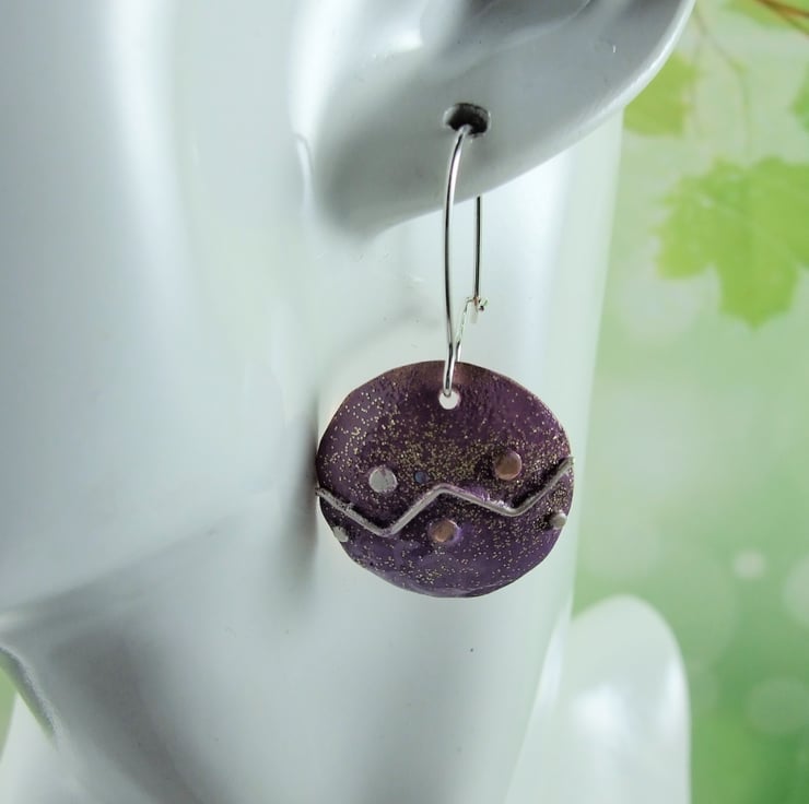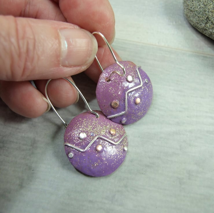 Purple and silver earrings. Copper with sterling silver with purple and lilac enamels, summer colours perfect for festivals.