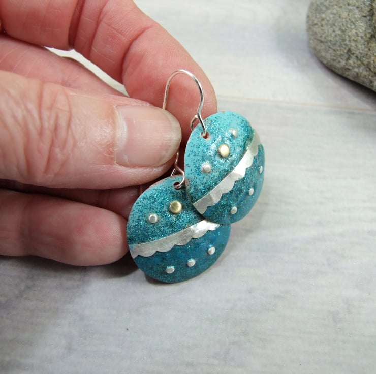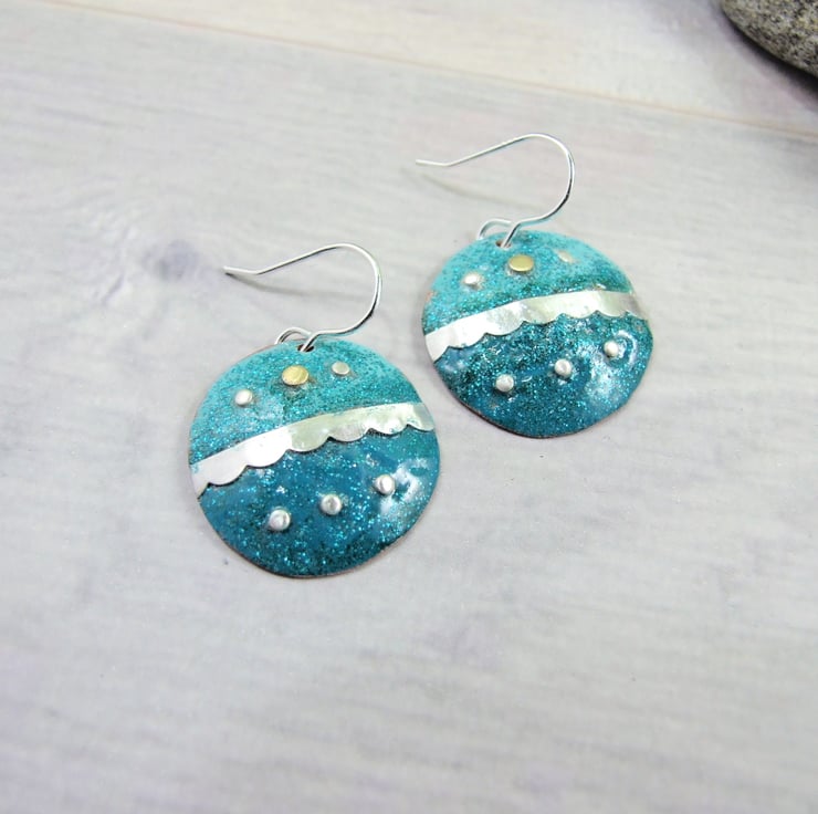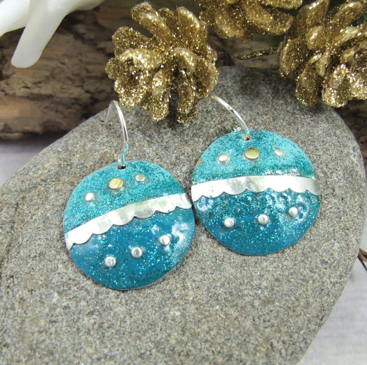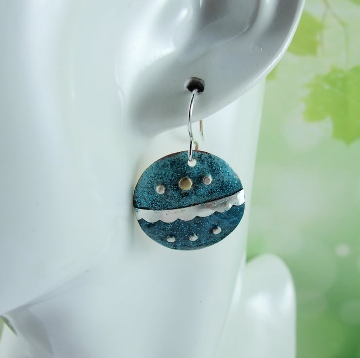 I cut the circle bases from copper sheet then slightly domed. I added sterling silver and copper beads as well as wire to create patterns and texture, shaped by hand and all soldered securely in place. I finished the earrings with cold fired enamels in shades of green and silver which start as a fine power and are delicately layered with a sieve and tiny brush then fired in an oven to set to a glossy finish.