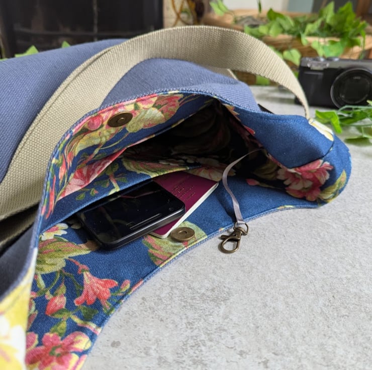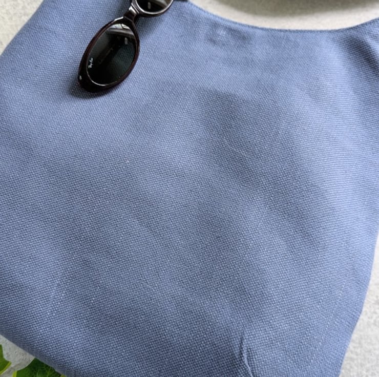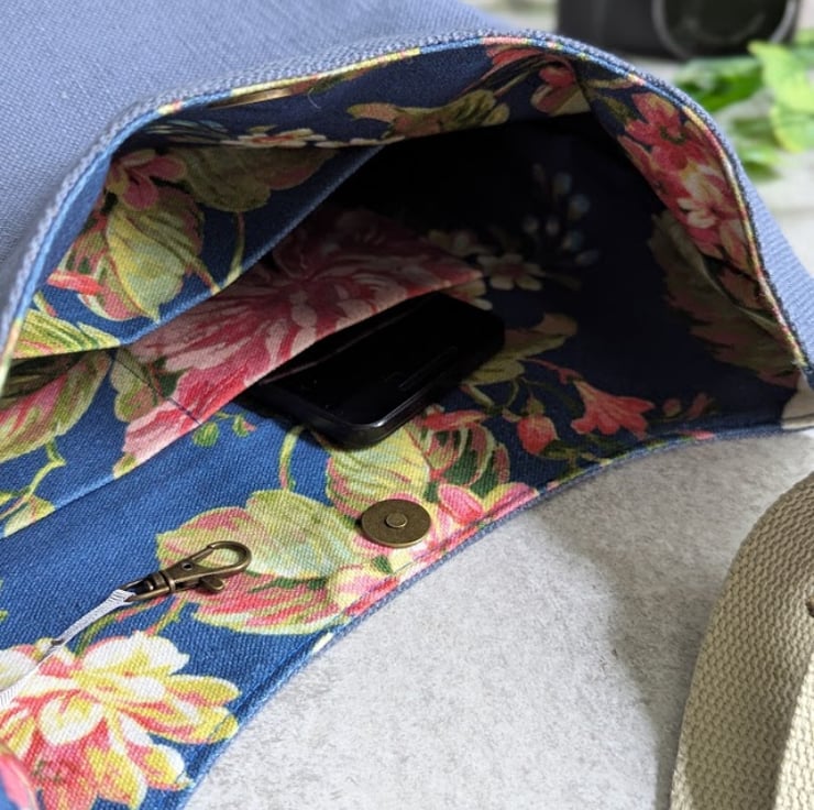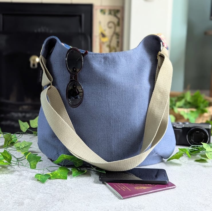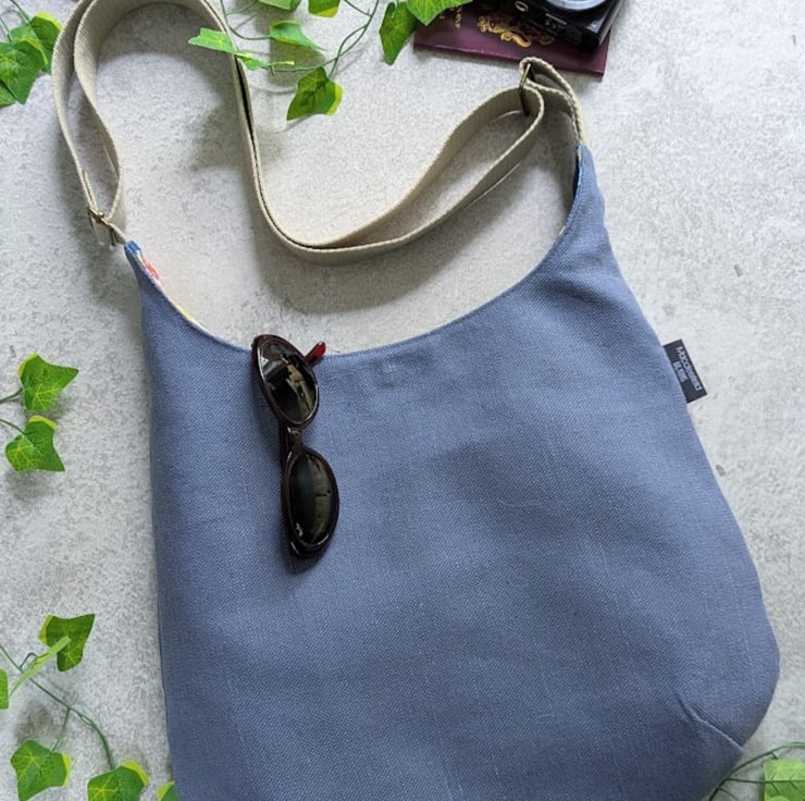 Handmade using deadstock grey blue cotton and linen mix canvas furnishing fabric and lined with a heavy weight floral fabric, this casual bag has stylish simple lines and would be a great summer bag.