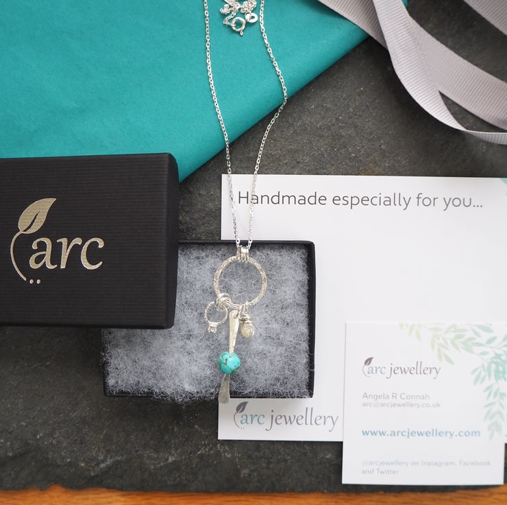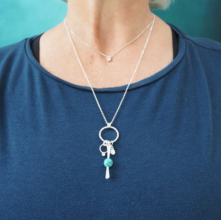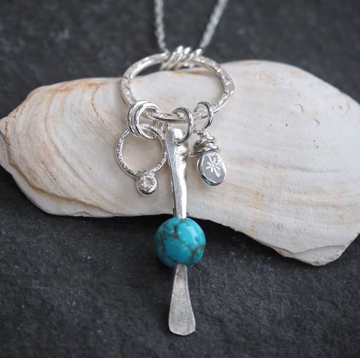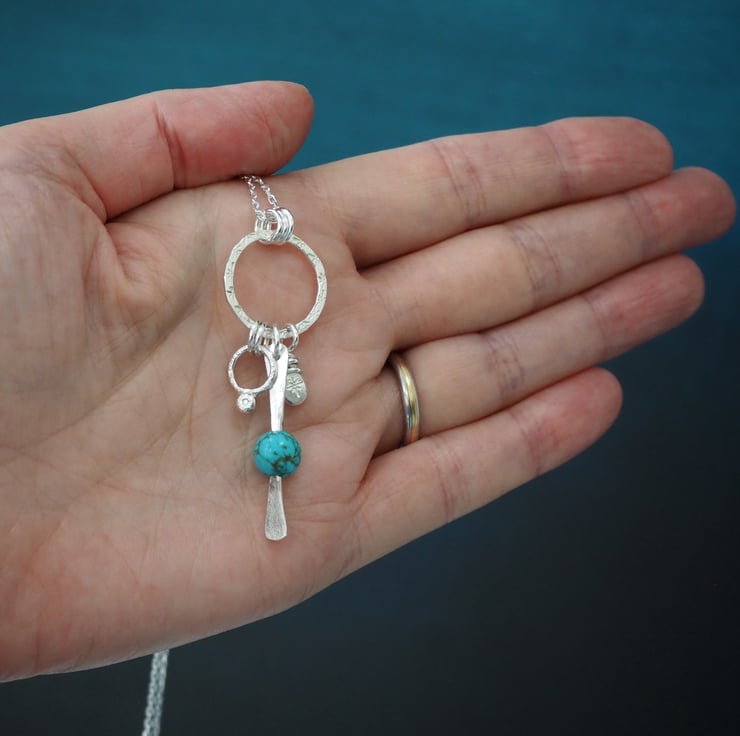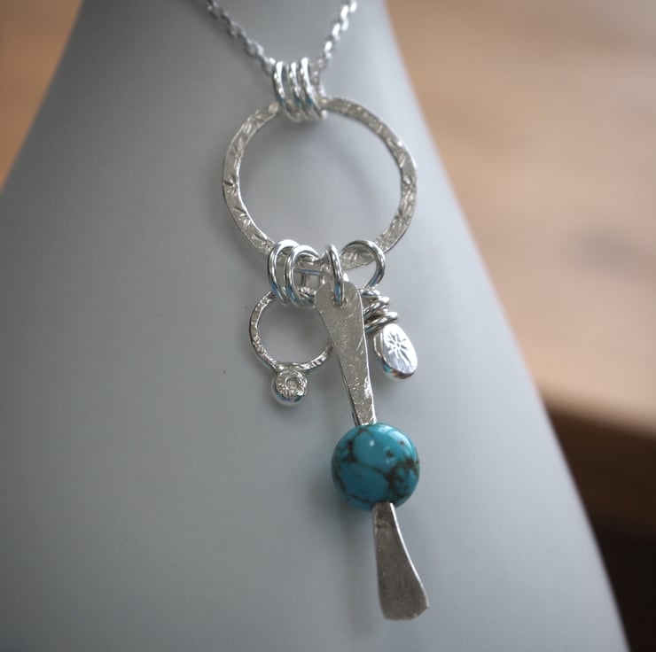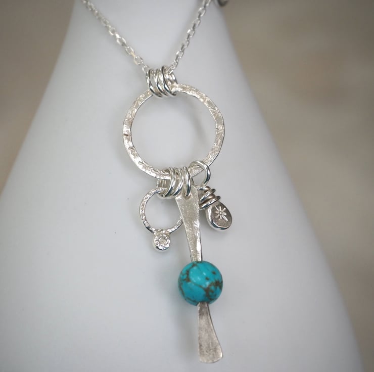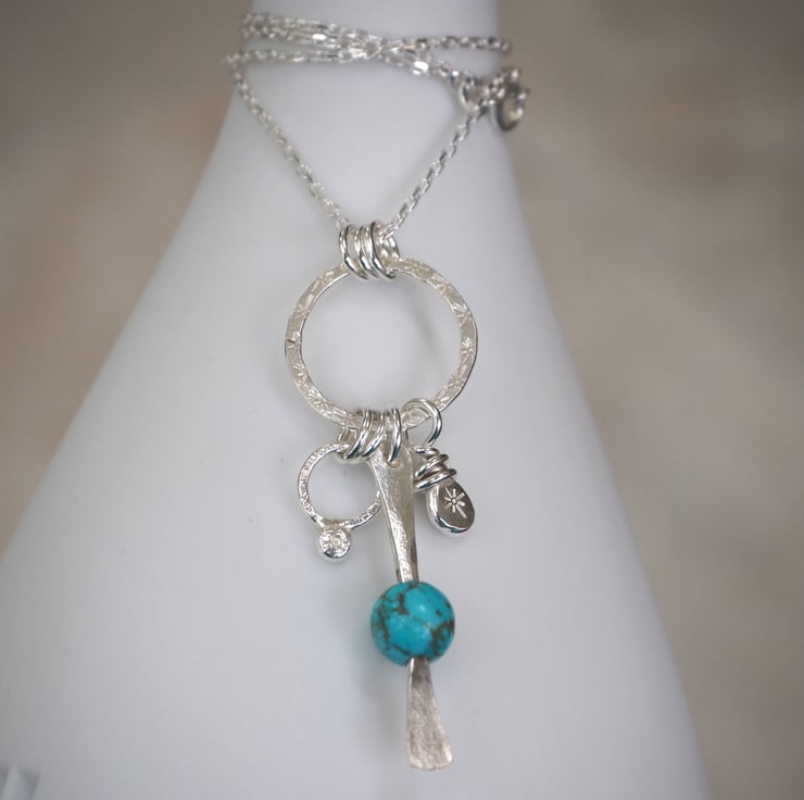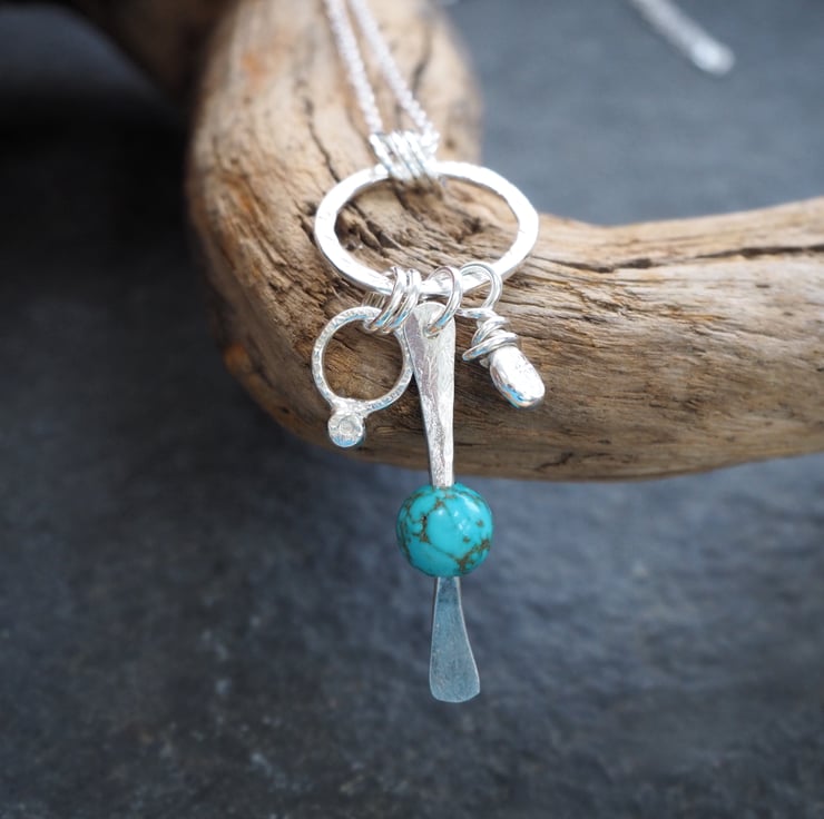 Handmade silver cluster, cascade charm pendant necklace with turquoise bead and hammered texture detail.