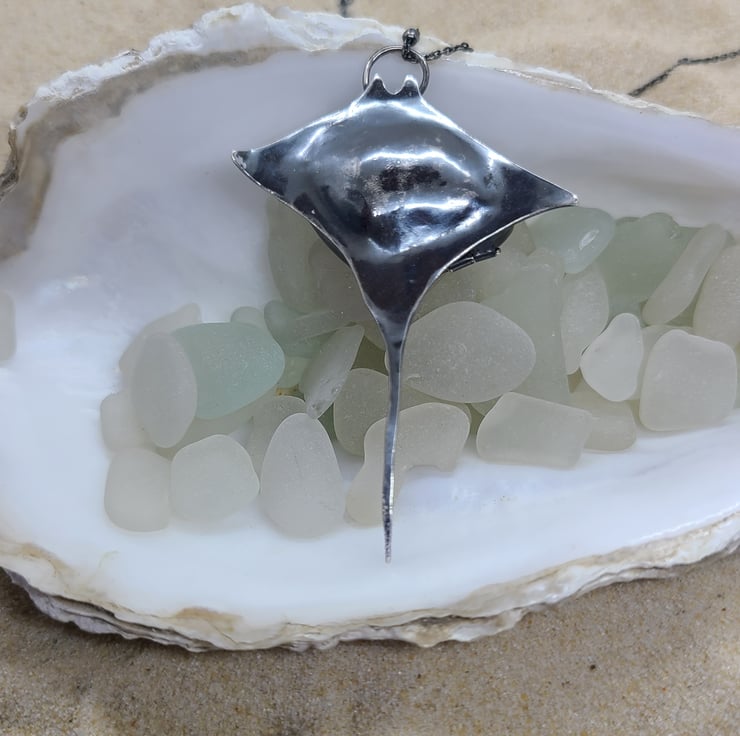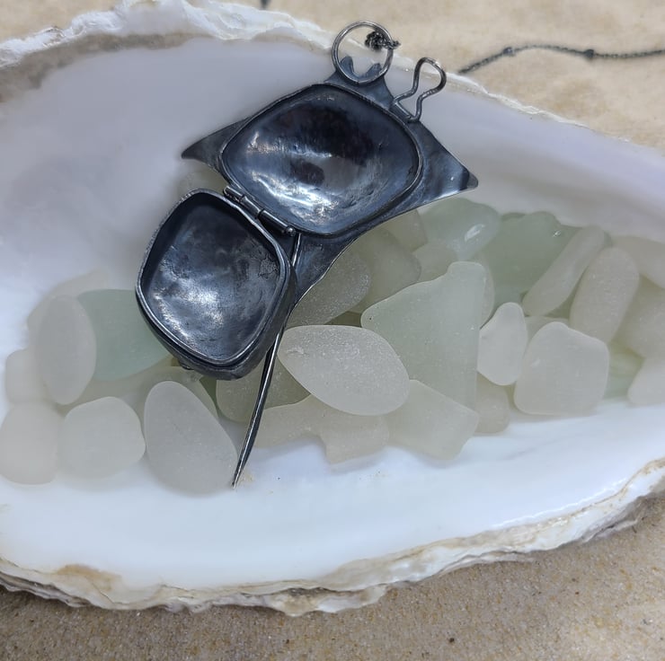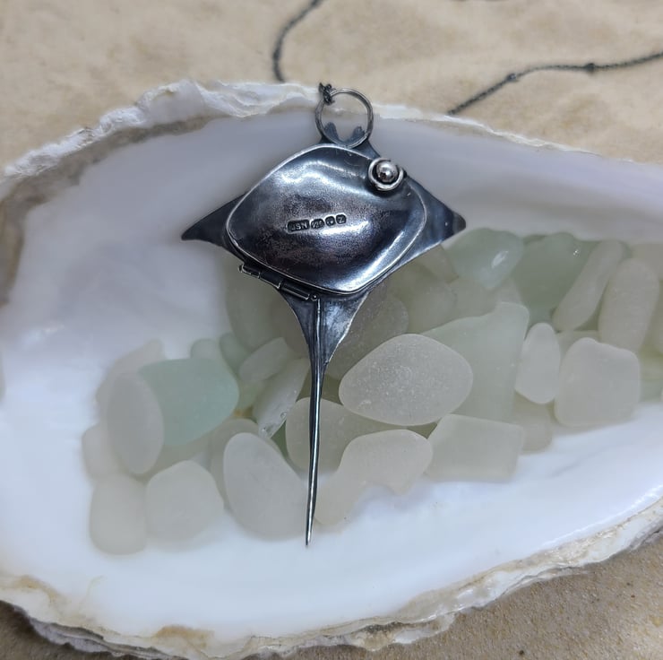 This unique handmade locket was inspired by Manta Rays. It has been darkened with liver of sulphur which will wear and change with the wearer. It is fully hallmarked.