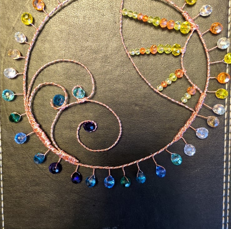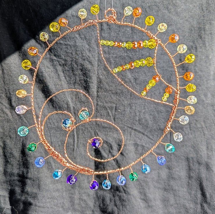 A beautiful suncatcher inspired by the beach and the sea. 3 waves curl from the bottom left and contrast with the sun shining from the top right. Finished with a frame of radiating beads.