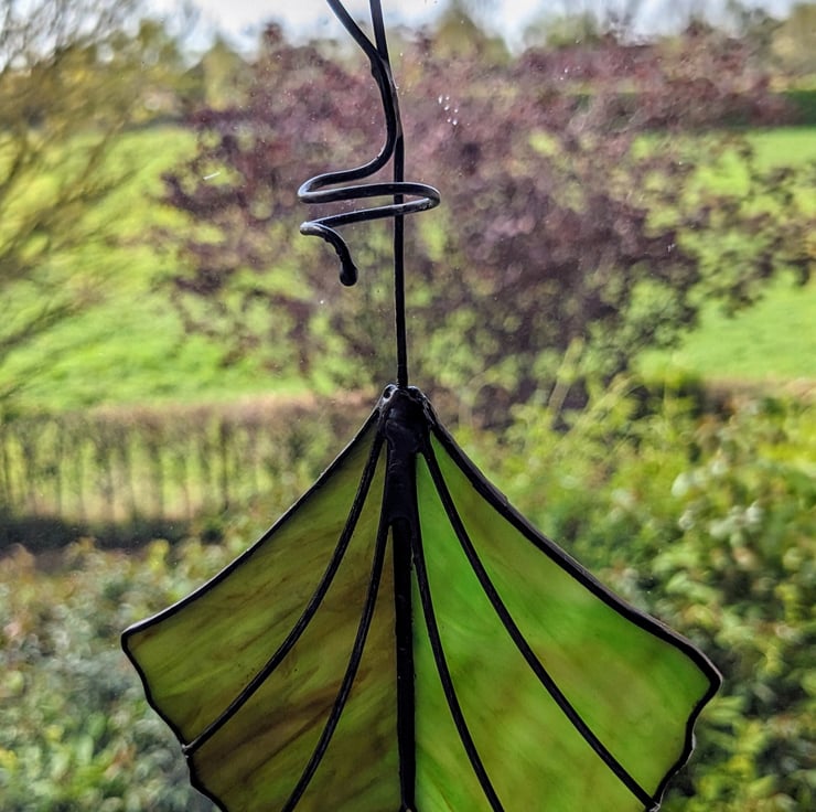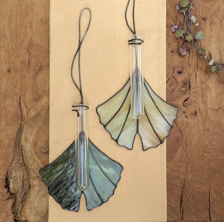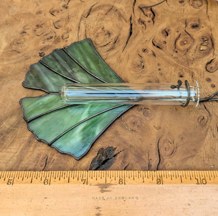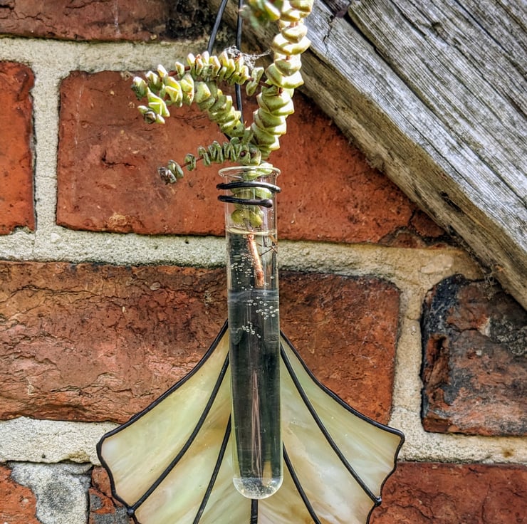 A stained glass propagation station, created using the Tiffany (copper foil) technique, complete with glass test-tube. Perfect for for propagating cuttings, displaying cut wildflowers or holding air plants. Makes an ideal gift for gardeners or houseplant lovers! Designed to resemble a ginkgo biloba leaf, the hanging suncatcher is available in your choice of two swirly colours - pale green and dark green. The glass test tube (10 cm x 1.6 cm) is easily removable for planting up and cleaning.