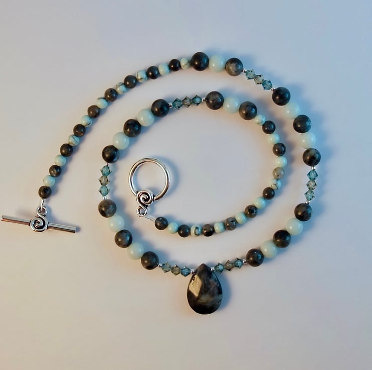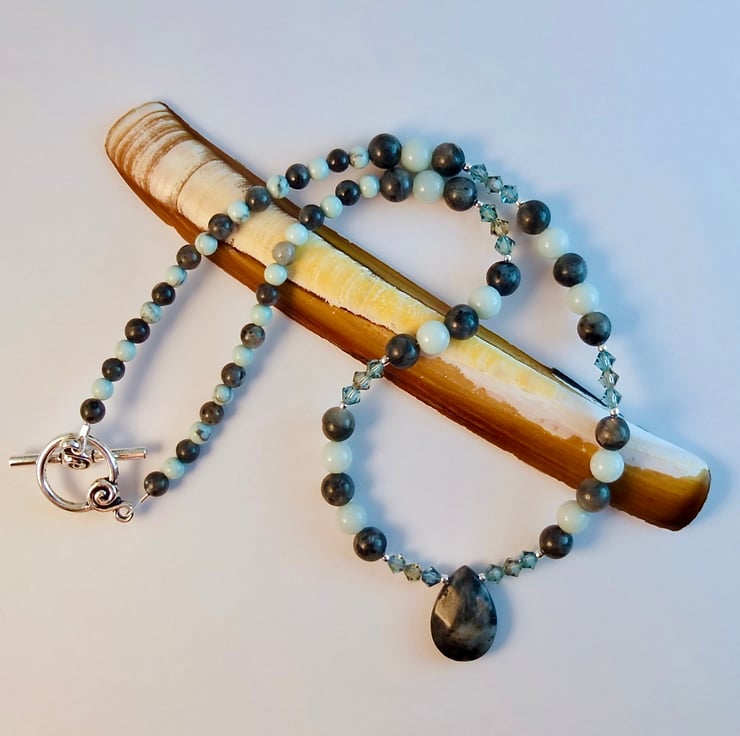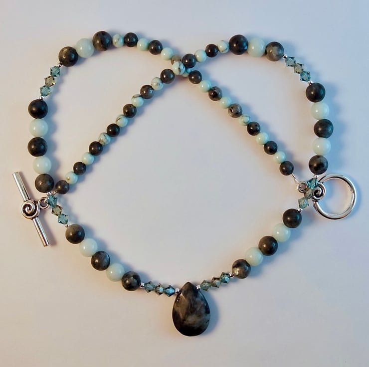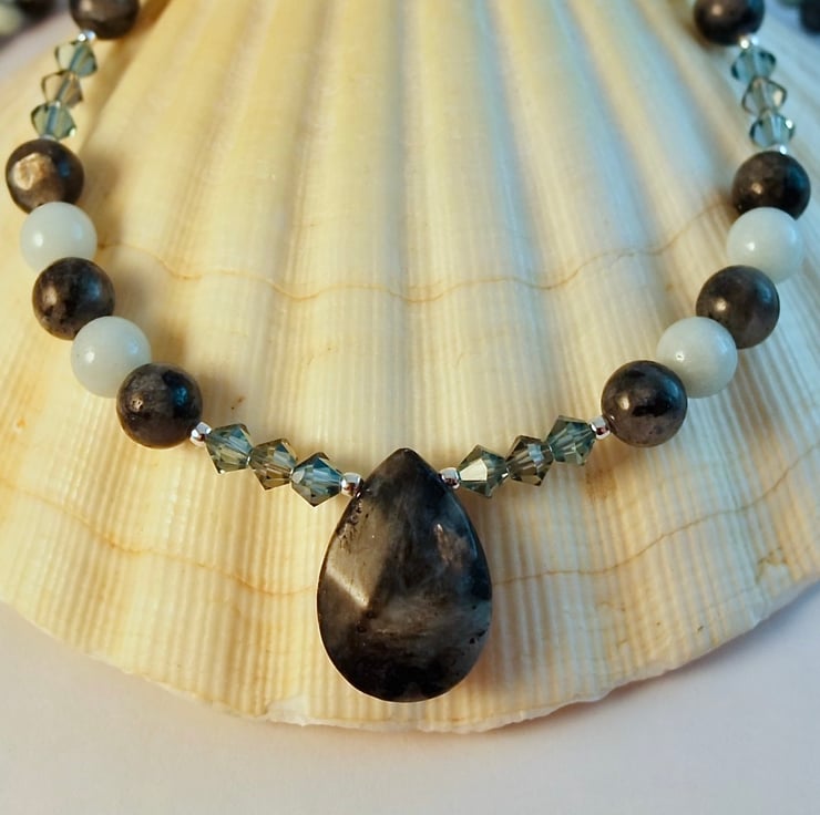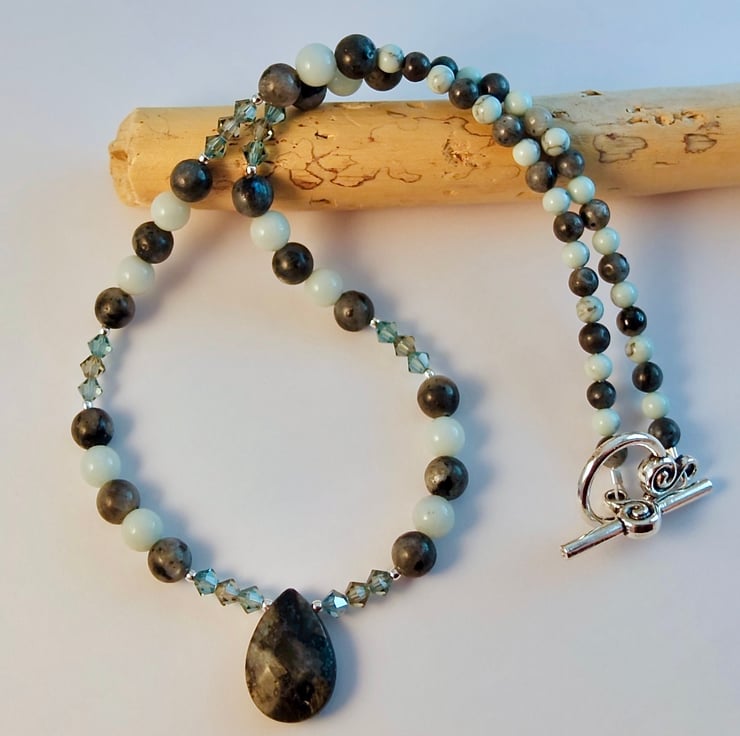 Necklace of mixed gemstone and crystal beads, with a Larvikite pendant centrepiece, in shades of smoky grey, light turquoise and silver.