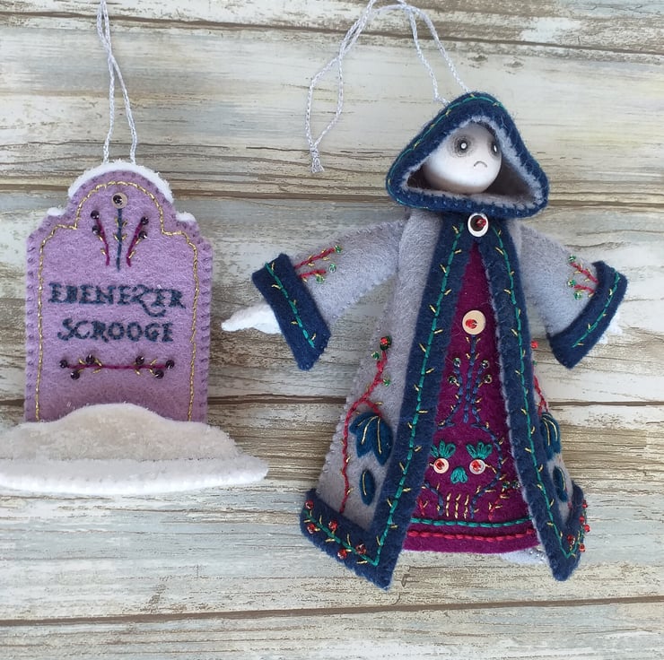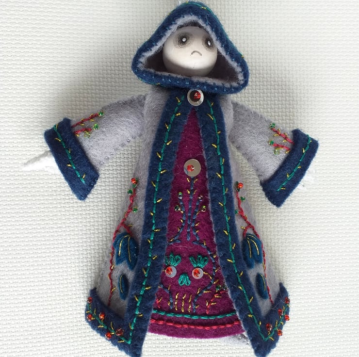This Christmas ornament is made with good quality 100% wool felt, DMC embroidery threads, metallic thread as well as tiny seed beads and wooden beads - wire and pipe cleaners are also used in the construction of this ornament, and the head is painted with acrylic paints and coloured pencils.