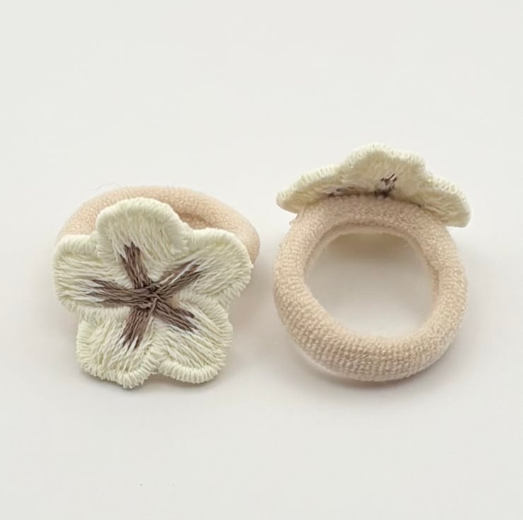 Handmade Cream with Brown cotton embroidered flowers, set on nude mini bands for a soft comfortable hold.
