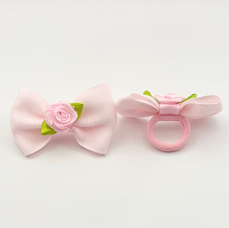 Handmade grosgrain ribbon bow in baby Pink with a pink satin style flower, set on pink mini bands for a soft and comfortable hold.
