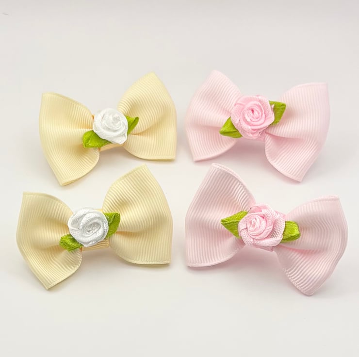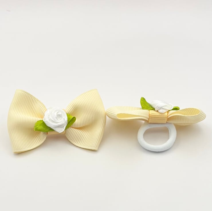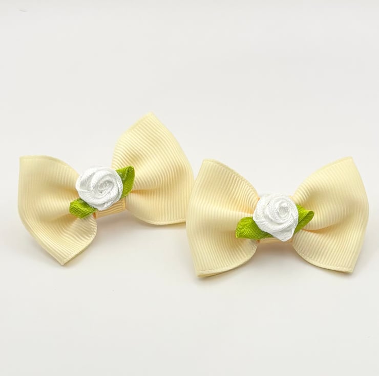 Handmade grosgrain ribbon bow in lemon yellow with a white satin style flower, set on white mini bands for a soft and comfortable hold.