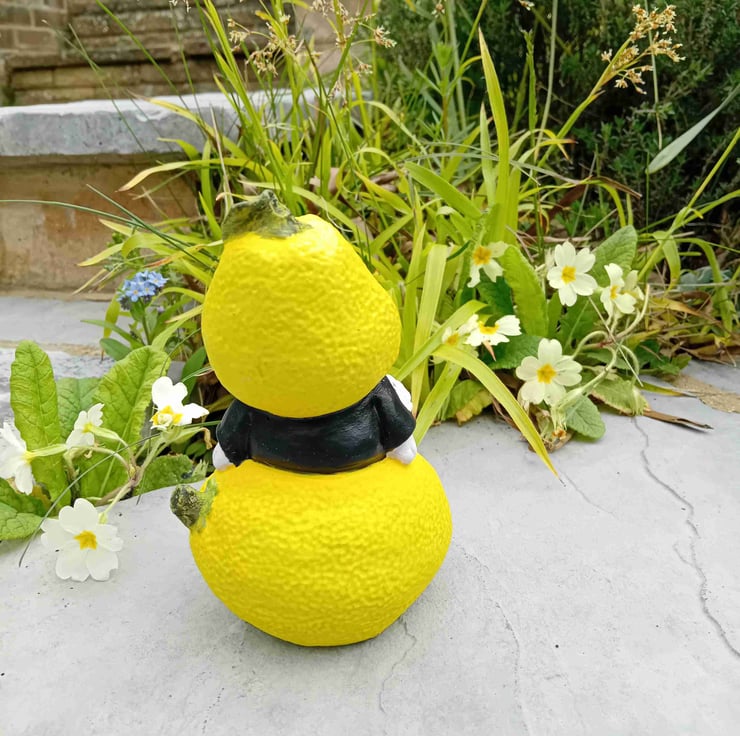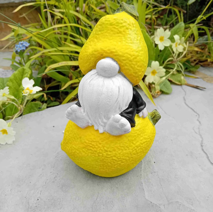 A unique representation of a Gnome On A Lemon. This one for sale is finished in black pyjamas. Can be customised to order. A nice solid ornament that will look good anywhere. Finished in Clay Magic.