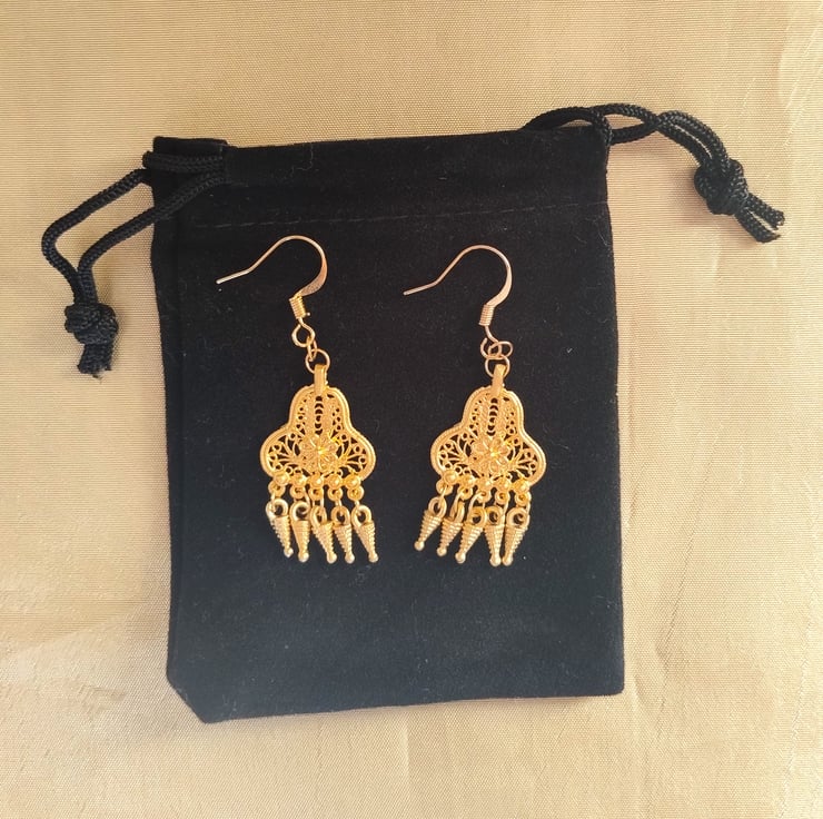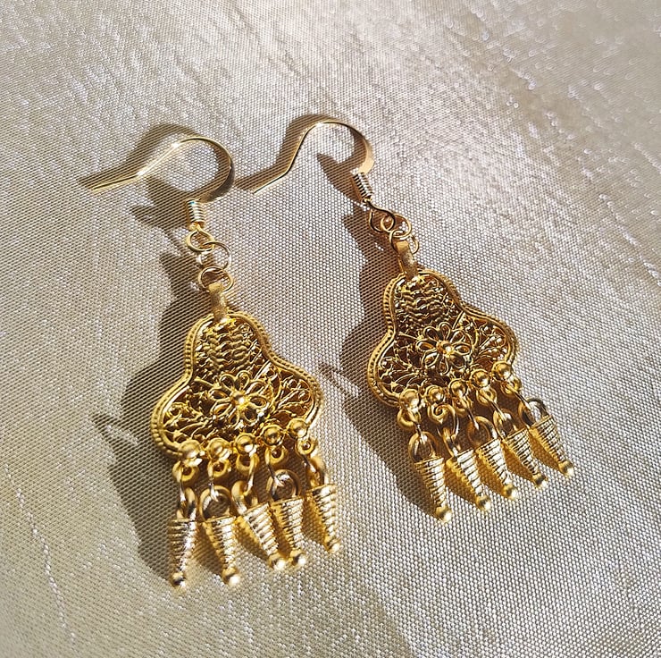 Ancient Greek style dangle chandelier earrings made from 24 carat matte gold plated brass. All parts are nickle free.