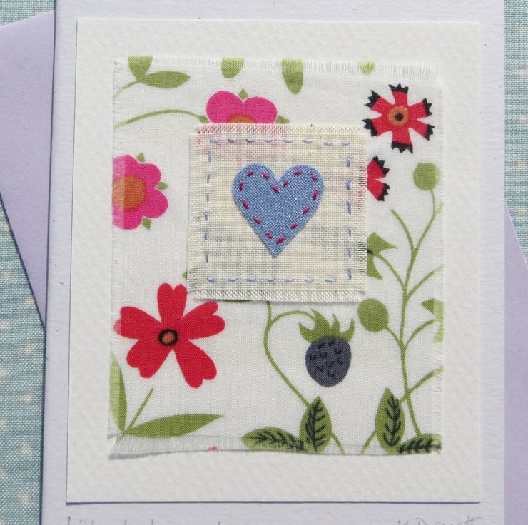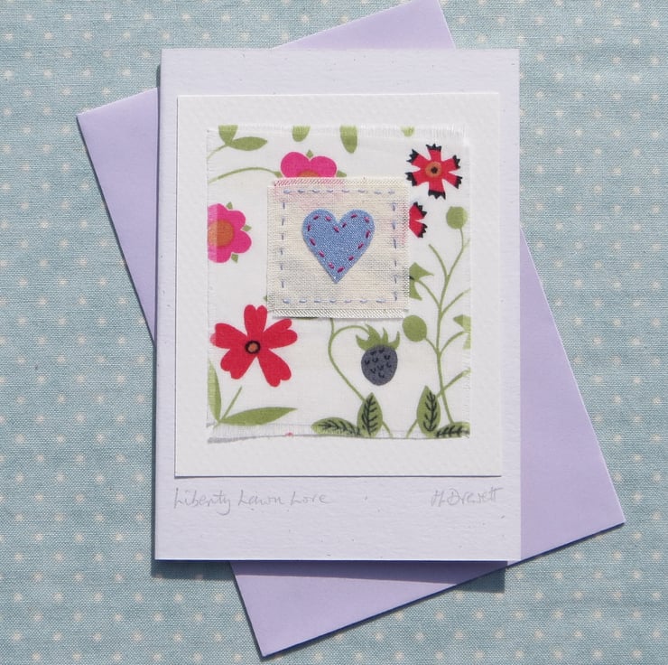 Hand-stitched hand dyed applique heart with cheerful Liberty Tana Lawn cotton print background. Very pretty, perfect for any time when you want to send your love to someone in a special way. The title is: Liberty Lawn Love