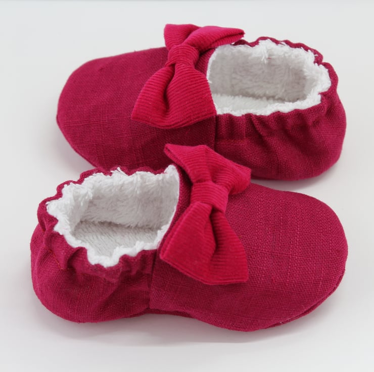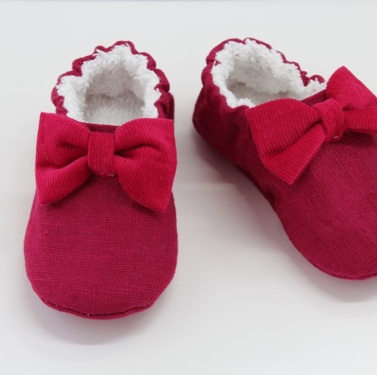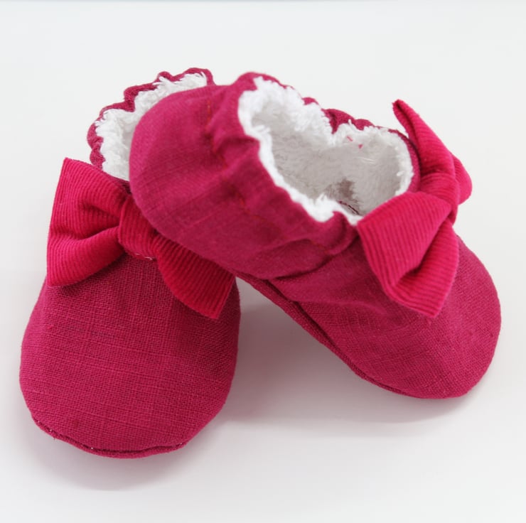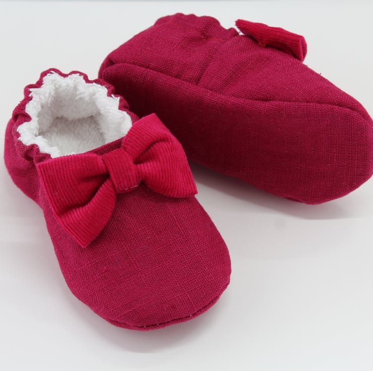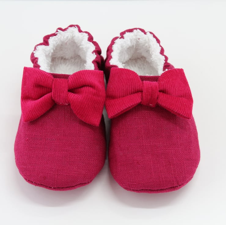 The outer shoe and sole is made using a raspberry colour linen with a coordinating corduroy bow, the inner is fully lined with Terry Towelling.