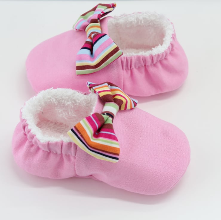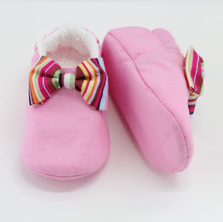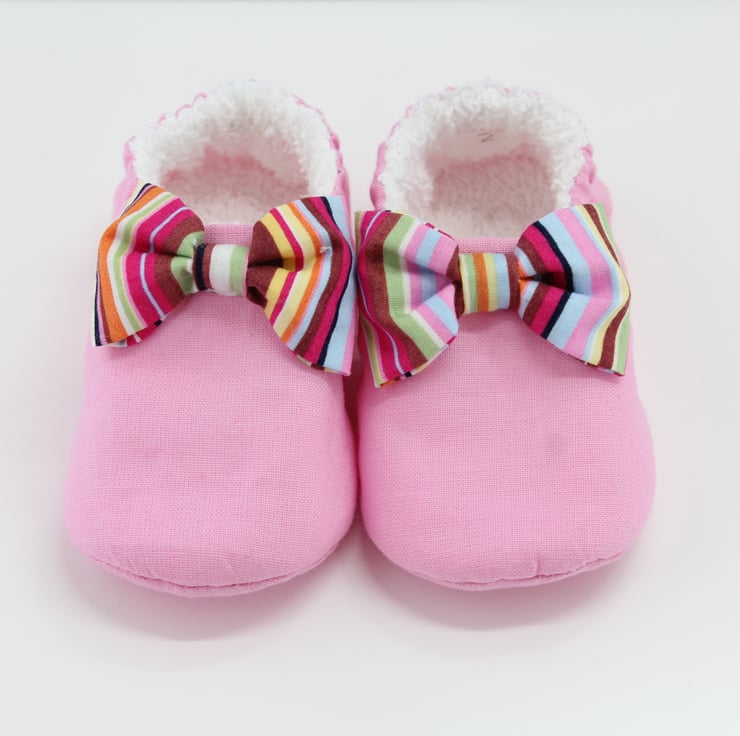 The outer upper and sole are made using 100% cotton with a fun striped bow and the inner is fully lined with Terry Towelling.