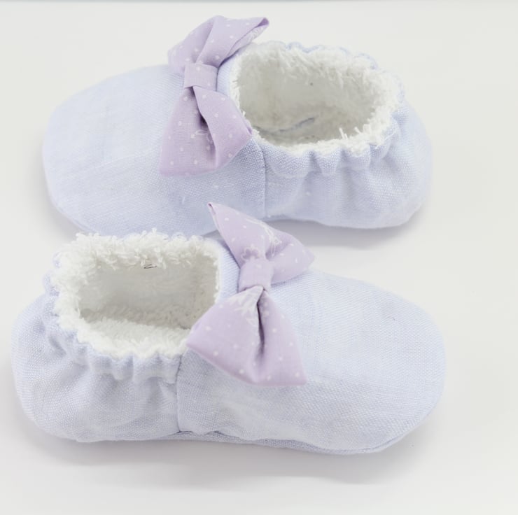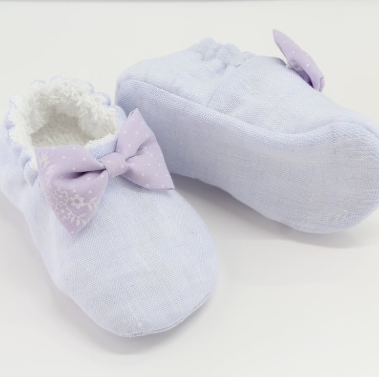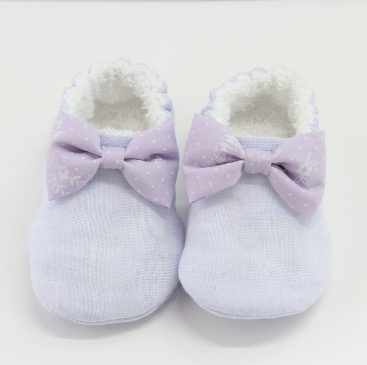 The outer upper and sole are made using a pale lilac linen the inner is fully lined with Terry Towelling, and the bow is a slightly darker lilac cotton with tiny white flowers on.