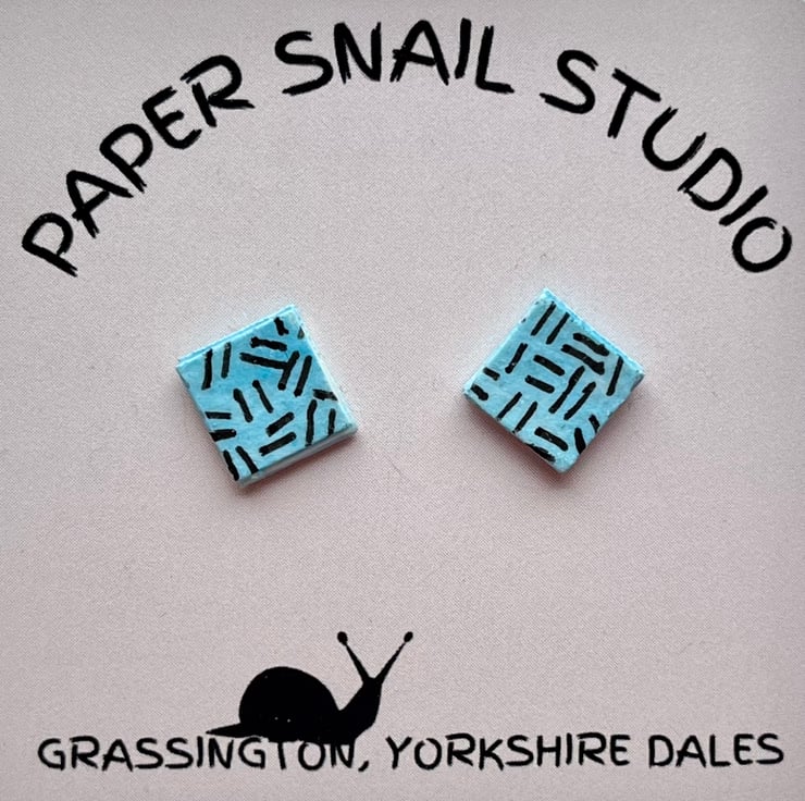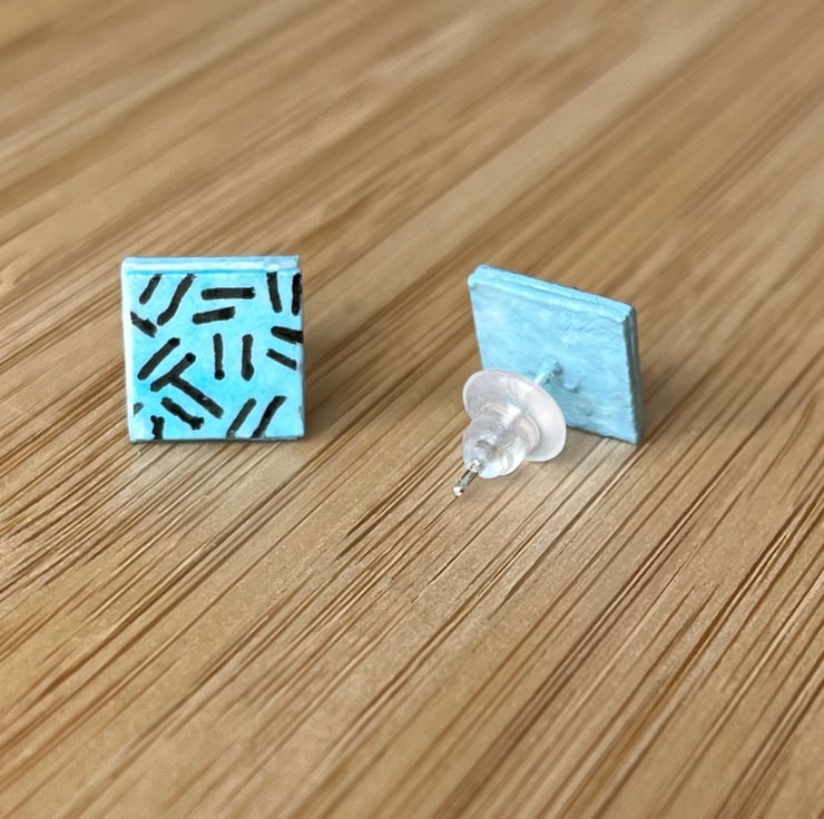 Sweet little square paper earrings in Light Blue with a delicate Black Line Cross Hatch design. Individually created and painted so no two are identical.