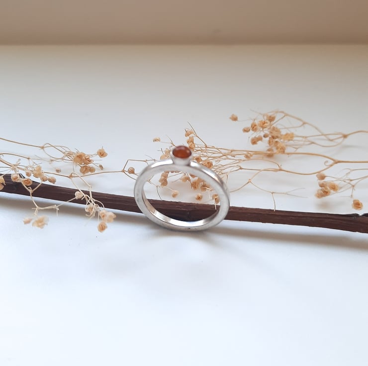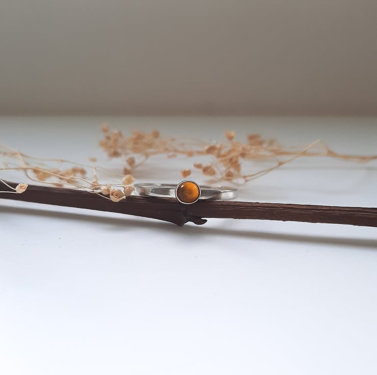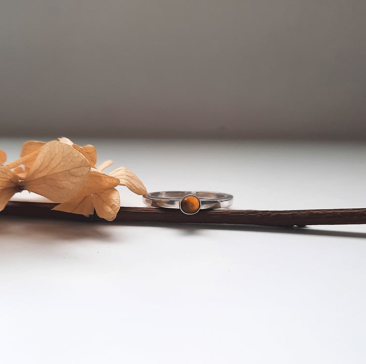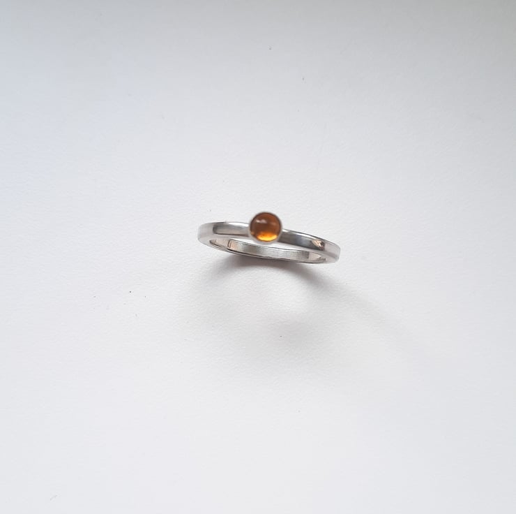 A 4mm round citrine cabochon sits on a 2mm rectangular silver ring band. I would advise against immersing the ring in water as this could loosen the stone.