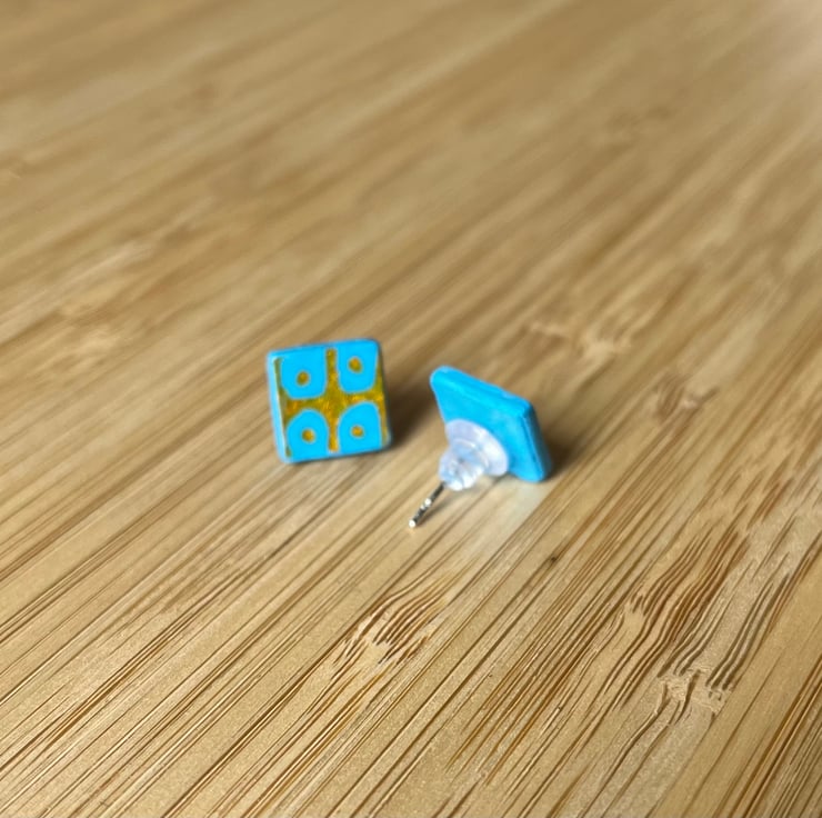 Sweet little square paper earrings in Blue with a Bronze design. Individually created and painted so no two are identical.