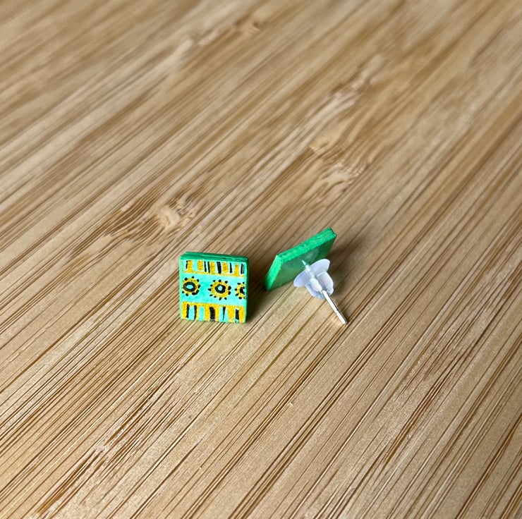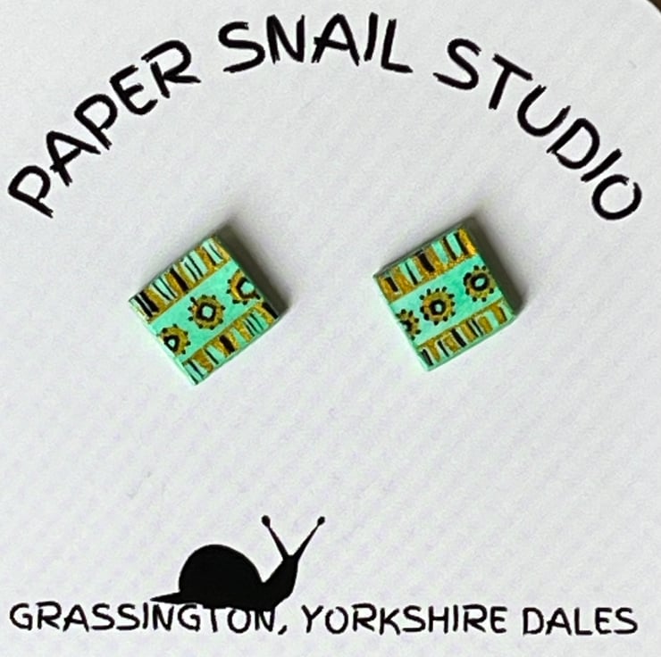 Sweet little square paper earrings in Grassy Green with a Bronze and Black design. Individually created and painted so no two are identical.