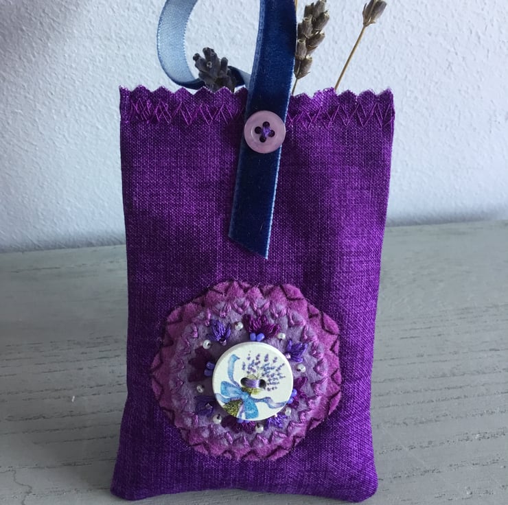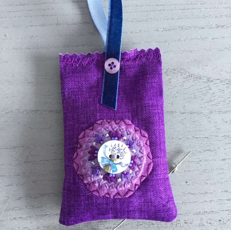 This Hand Embroidered Lavender Button Lavender Bag is filled with organic Lavender grown in my garden……give the bag a scrunch and the lovely lavender fragrance bursts out……