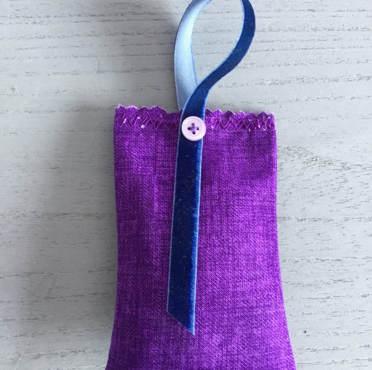 With its long velvet hanging loop this Hand Embroidered Lavender Bag is ready to hang over a coat hanger, over a picture frame, door or cupboard handle…..or, to place in a drawer with clothes.