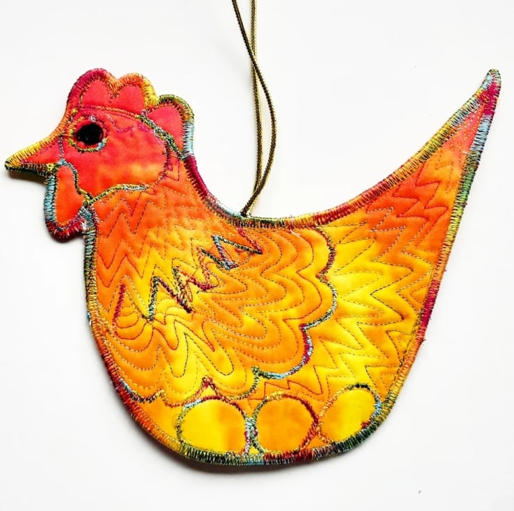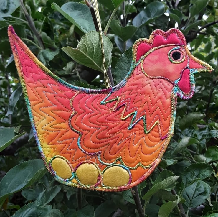 This is a handmade textile hen hanging decoration, sitting on 3 golden eggs.
