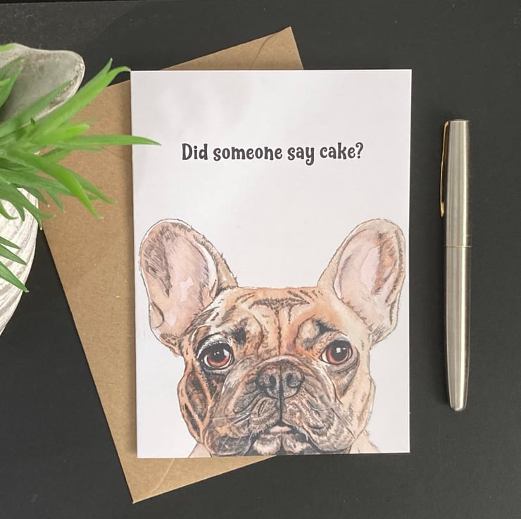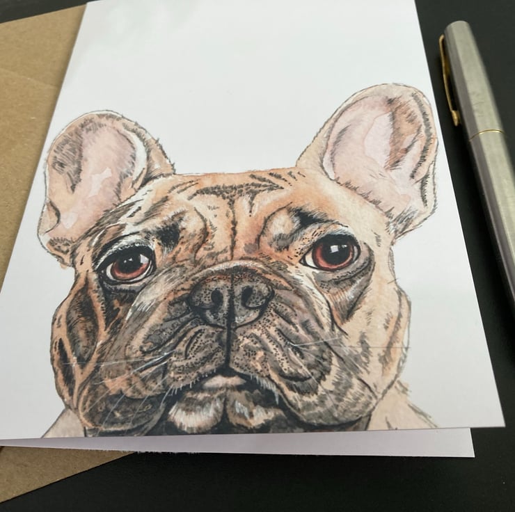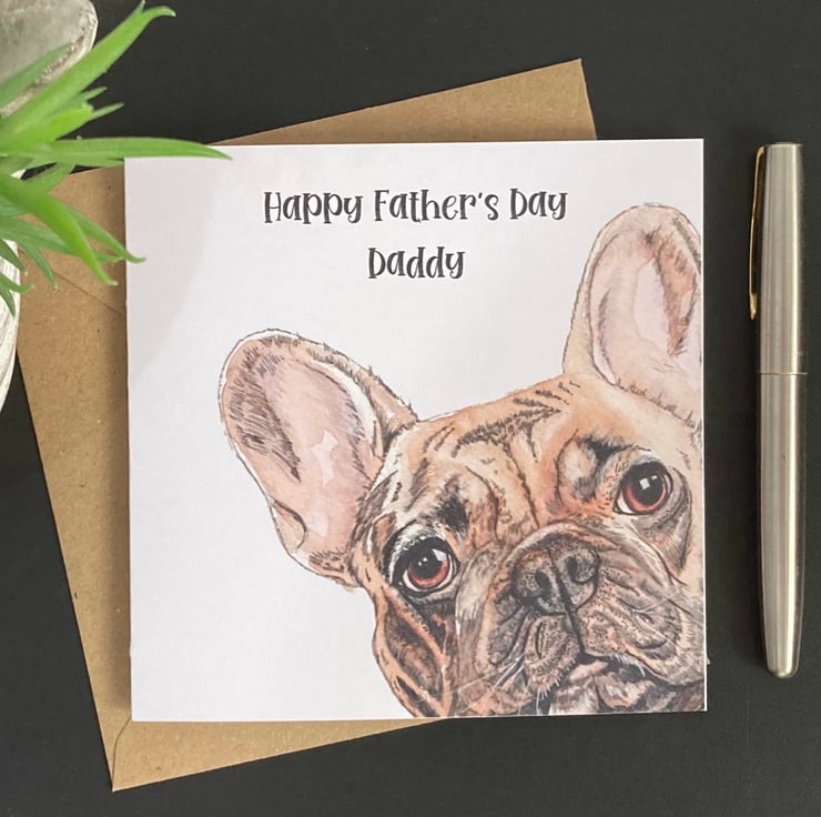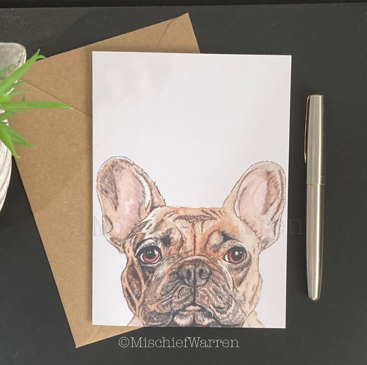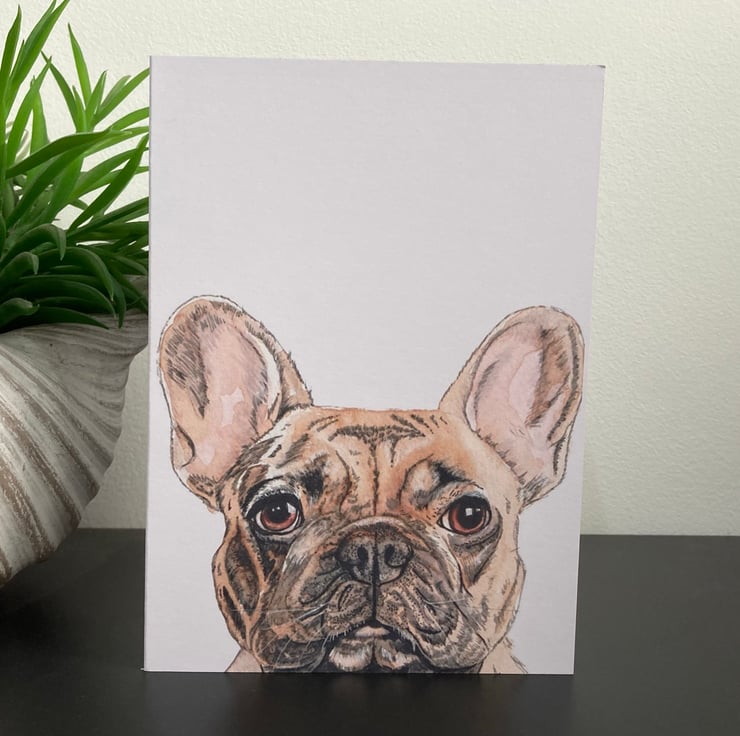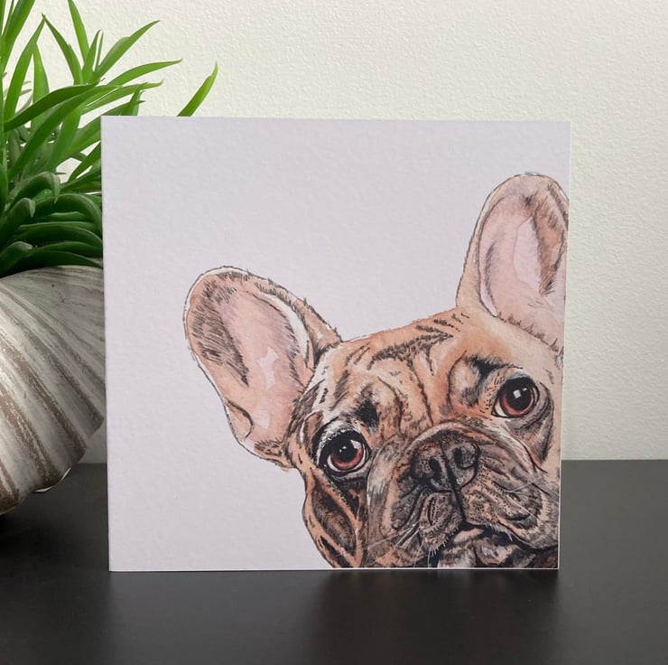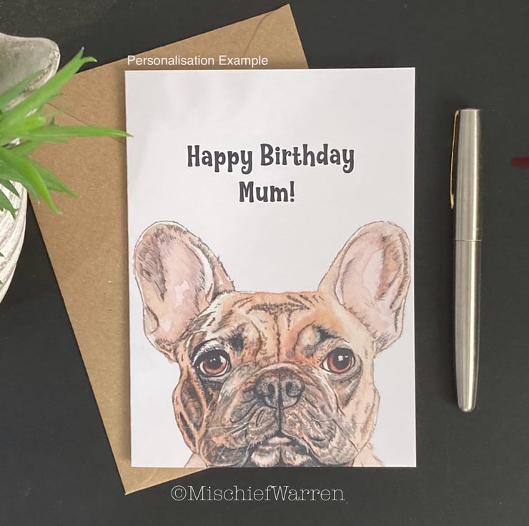 French Bulldog Birthday Card: a personalised or blank, fawn Frenchie dog card. Personalised for any occasion; birthday, Easter, Valentine’s day, Mothers Day, Fathers Day, Thank you, Congratulations or Christmas perhaps. Designed, hand drawn, hand painted and printed by me from my hand drawn and painted French Bulldog art.