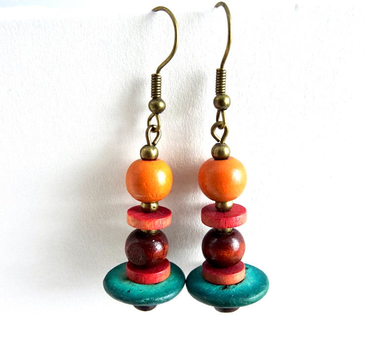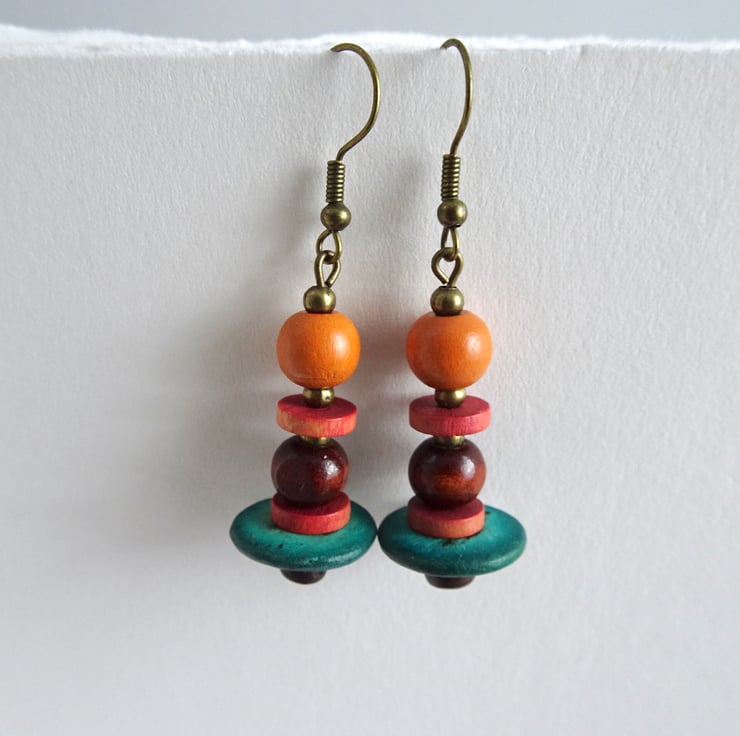 Jade green orange brown wood African inspired earth colours dangle drop earrings with brass effect spacer beads handmade by me using up-cycled and shop brought beads.