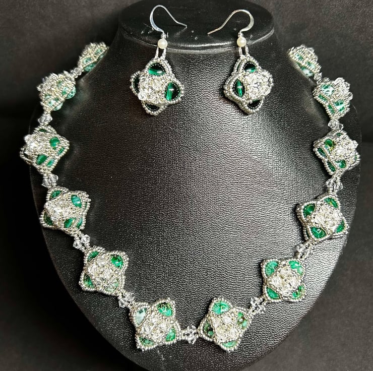 The result is a fabulous cascade of richly detailed seed beading combined with glorious sparkle and vibrant green colours and textures. The matching earrings perfectly complete the set.
