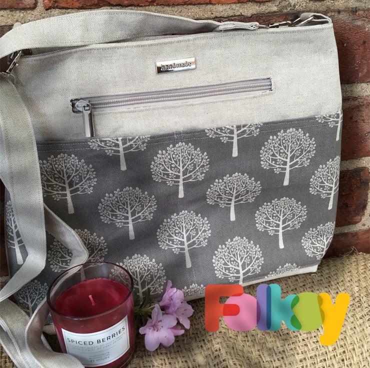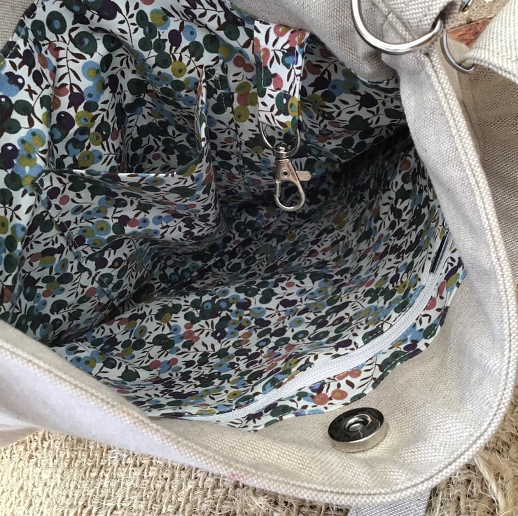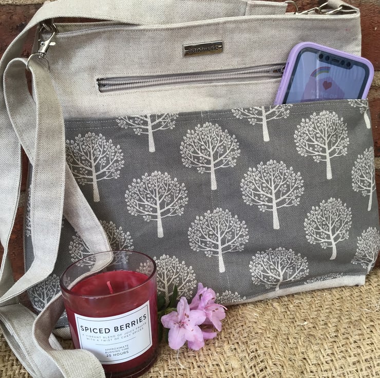 Lightweight and durable half panama linen look polyester cotton fabric, with a grey contrast tree pattern and fully lined in a quirky berry print polyester cotton. This bag has additional features of a good size mobile phone pocket and clip for keys, which has been my own addition the the pattern.