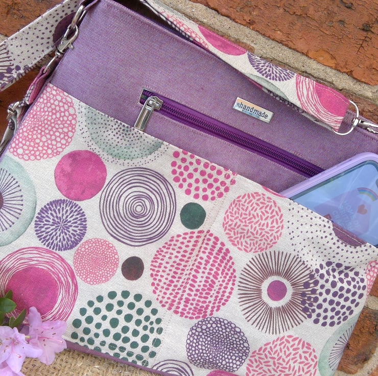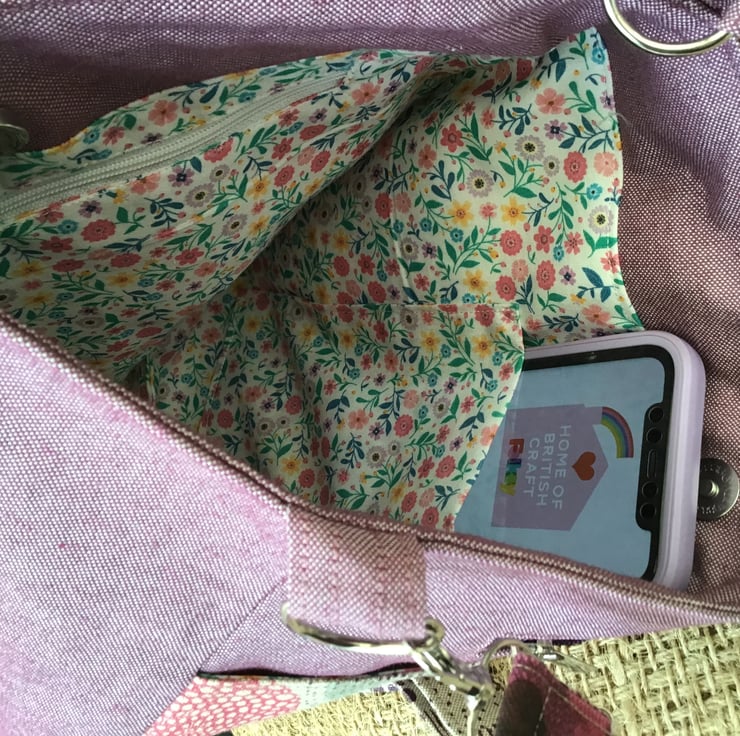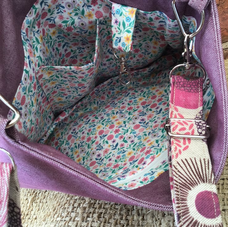 Lightweight and durable linen look mauve cotton polyester fabric, with a cotton panama contrast pattern and fully lined in a floral cotton. This bag has additional features of a good size mobile phone pocket and clip for keys, which has been my own addition the the pattern.