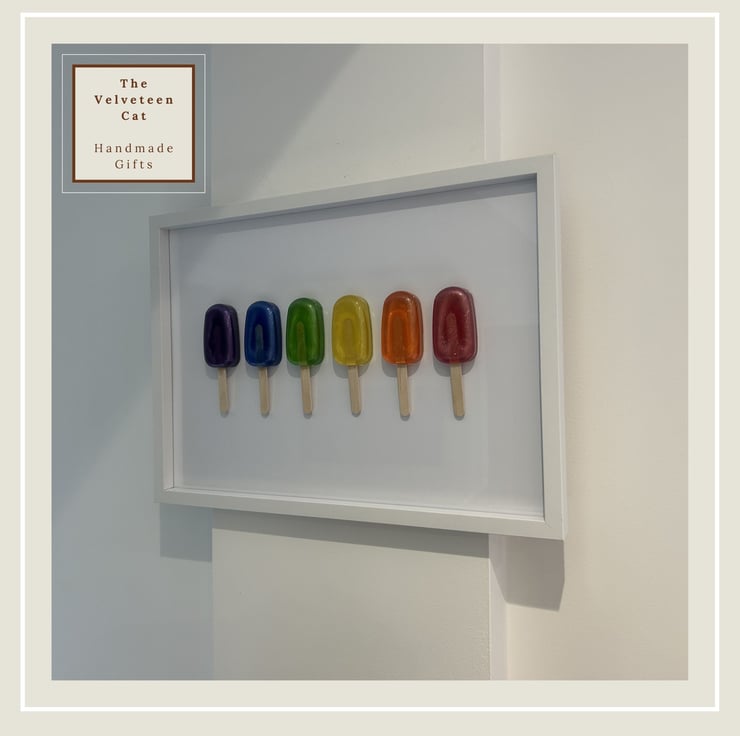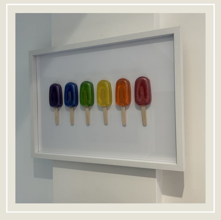 The lollies are lined up in a fantastical display at the centre of a white frame, secured directly to the glass. The backing is crisp white card, keeping the piece light and ready to hang. Whether you see it as a nostalgic nod to summer or a playful pop of colour, it’s sure to be a conversation starter - just make sure your guests don’t try to lick it!