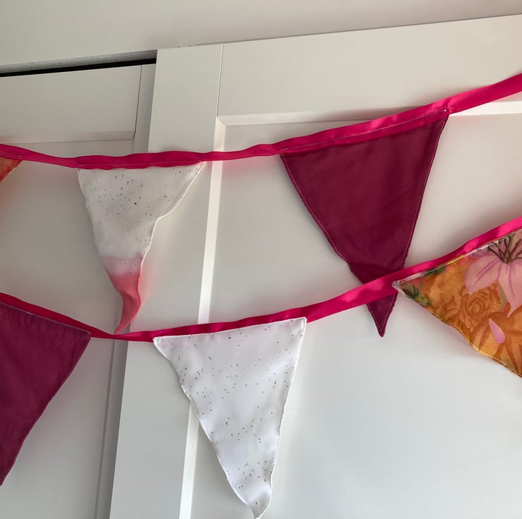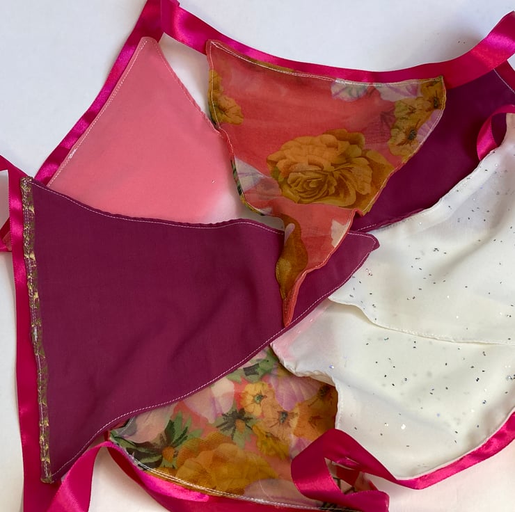 The fabric for this bunting comes from pre-loved chiffon saris that needed a new purpose. Three different fabrics have been used, in shades of pink, sewn to a bright pink satin ribbon. The ribbon measures 4m long and there are 12 flags, measuring 23 x 19cm. There is approximately 30cm of ribbon at each end which can be used to pin or tie the bunting in place.