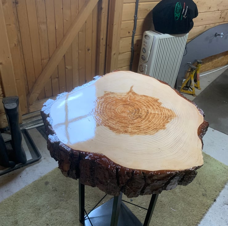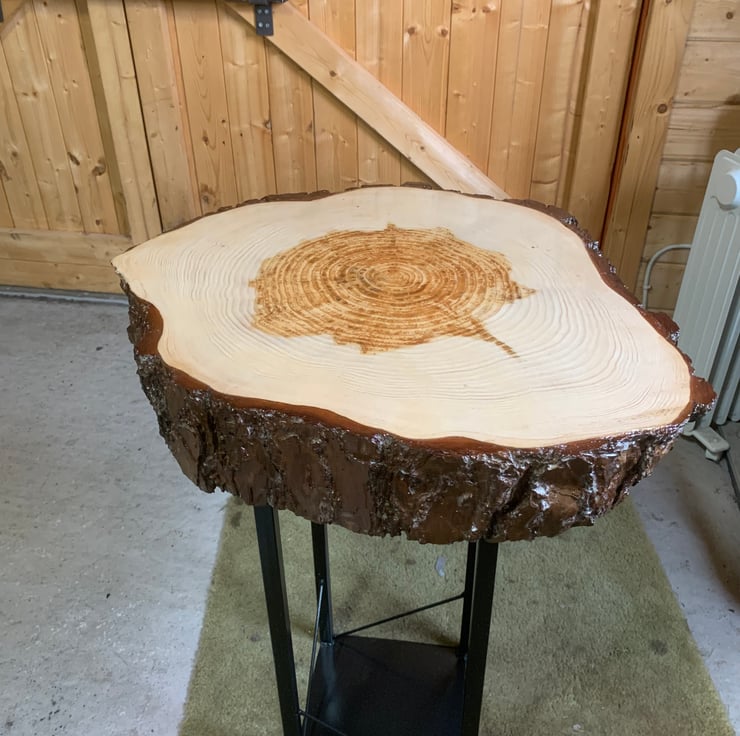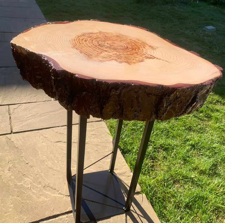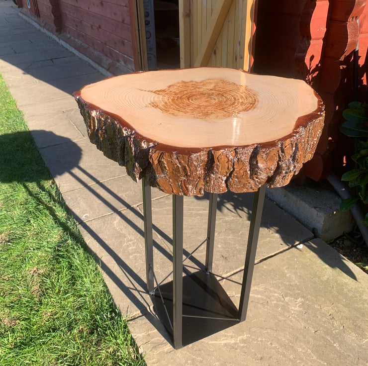 Hand made live edge side table. Bright lacquer surface 65cm diameter. Beautiful grain / rings . Steel legs/base. 85cm high
