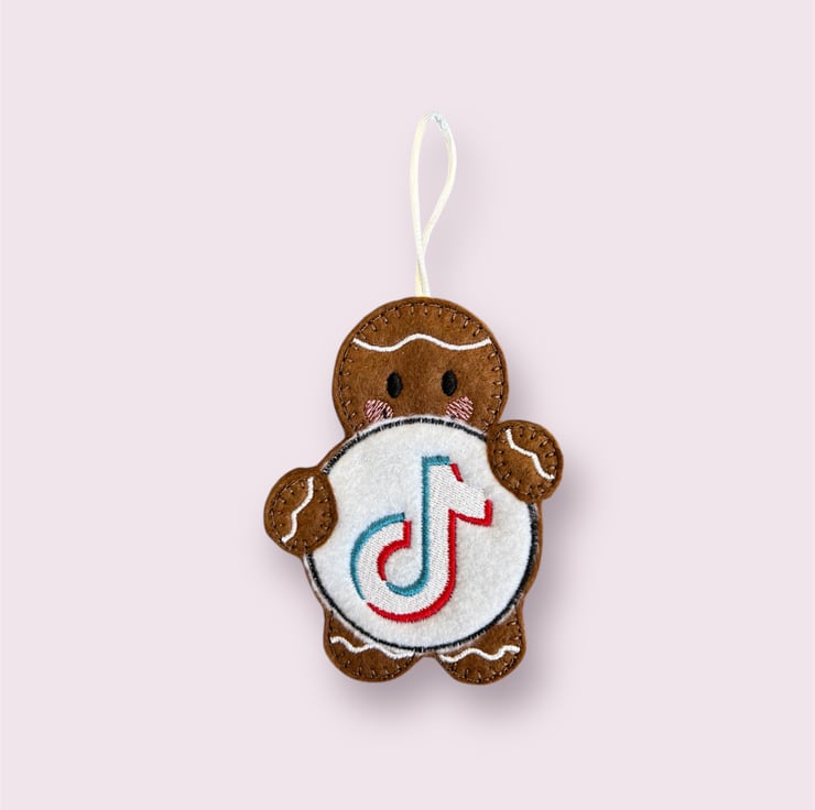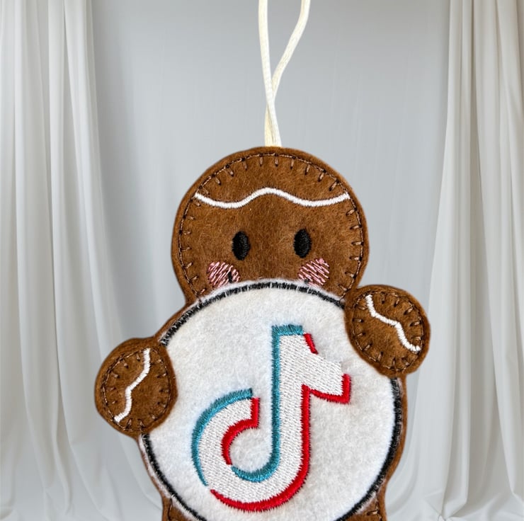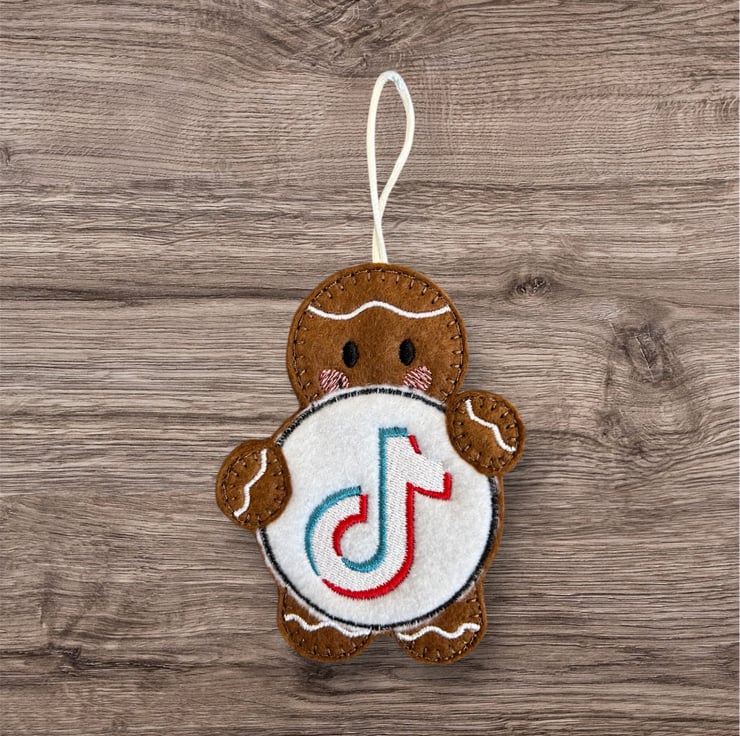 Gingerbread man holding a TikTok sign Embroidered Hanging Keepsake