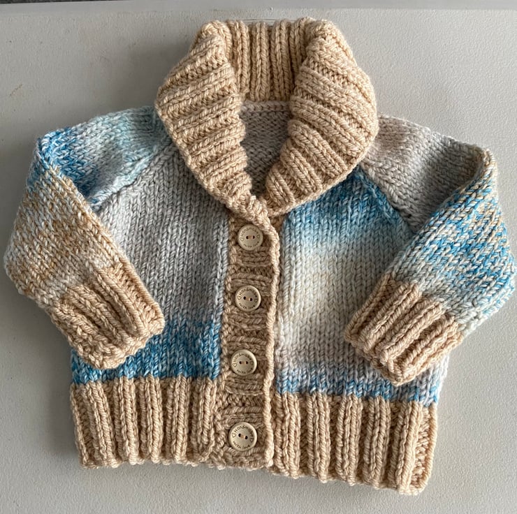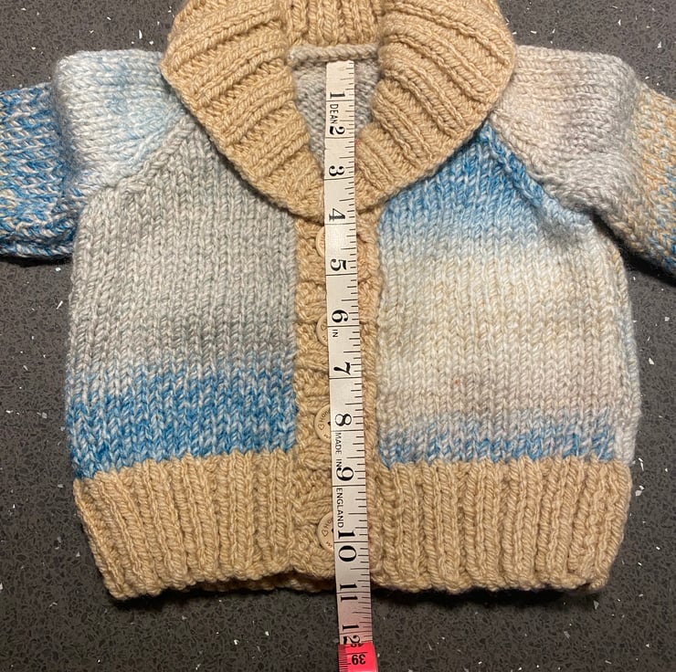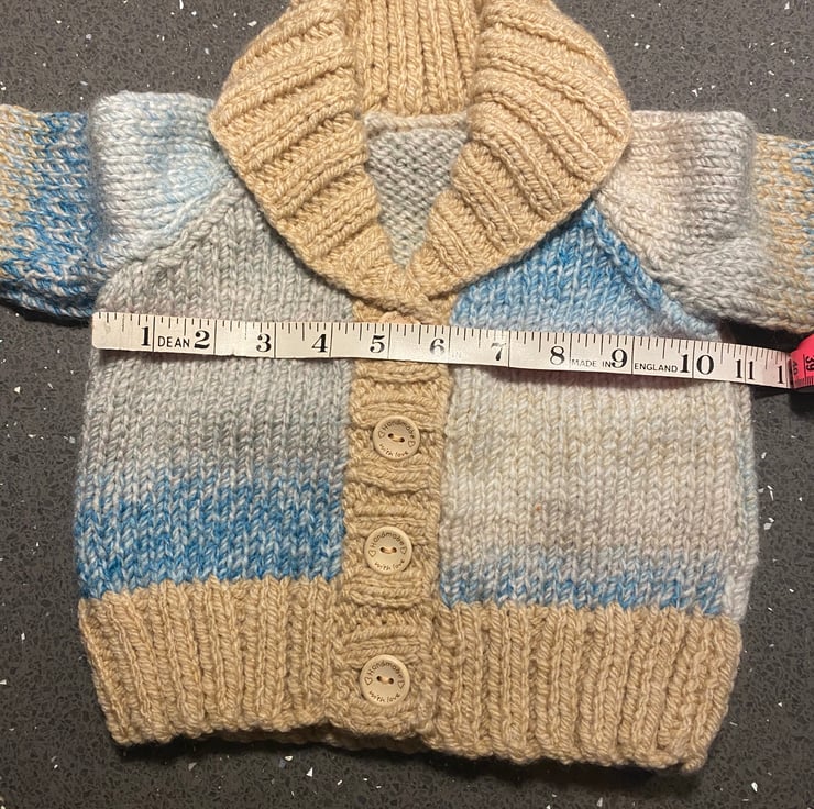 This chunky hand knitted cardigan is a size 20” chest.