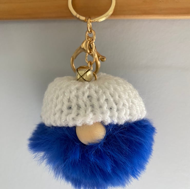 Blue Faux Fur Pom-Pom Gonk Keyring with White Hand Knitted Hat
