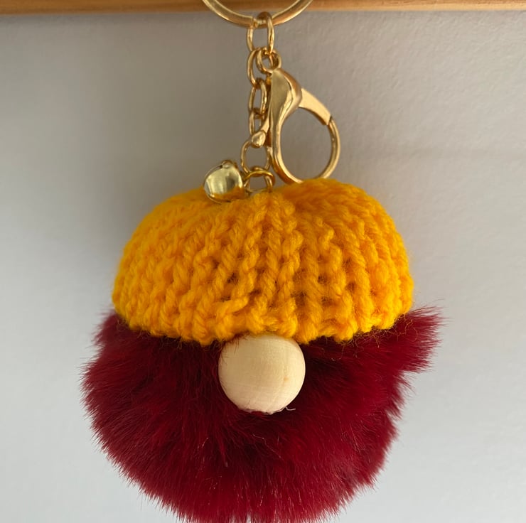 Burgundy Faux Fur Pom-Pom Gonk Keyring with Yellow Hand Knitted Hat