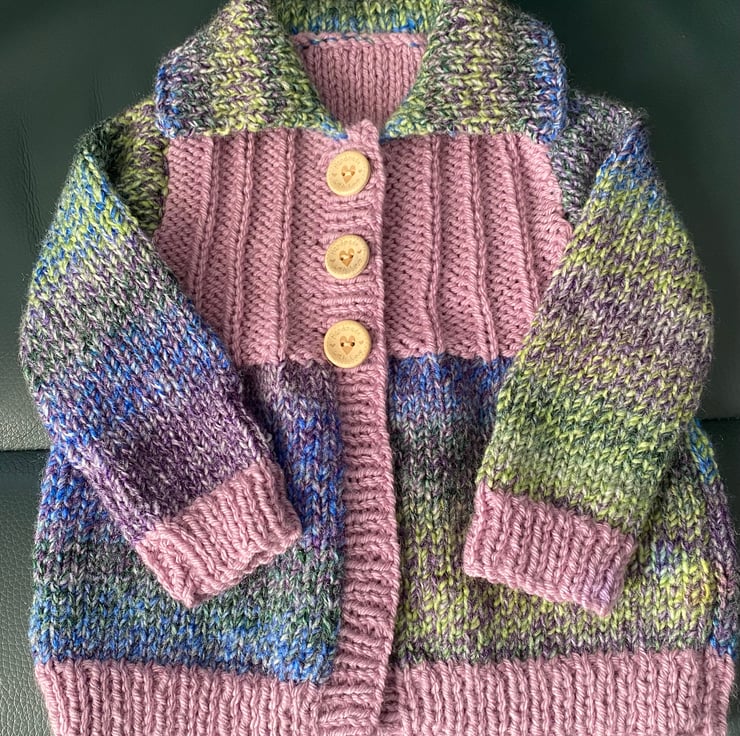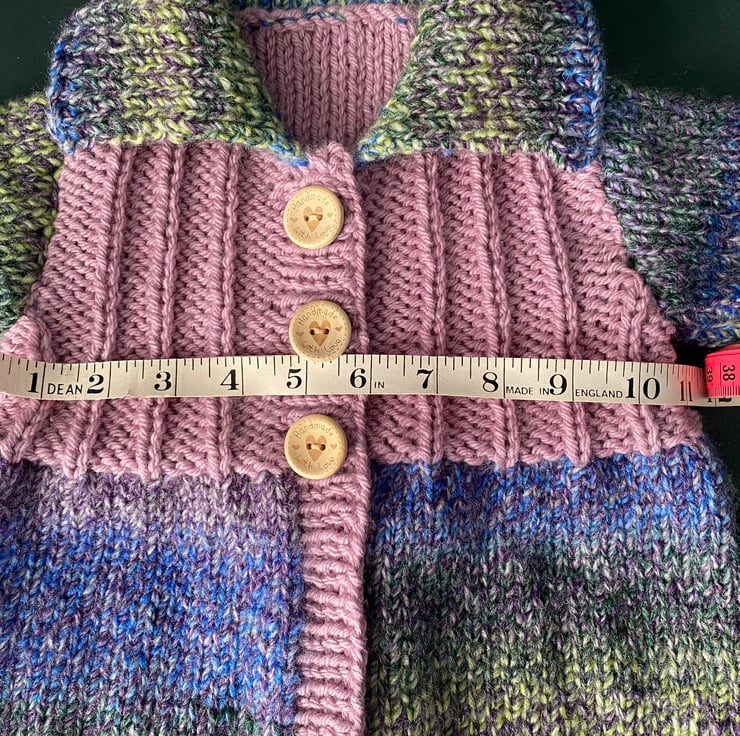 This chunky hand knitted cardigan is a 20 to 22”chest.