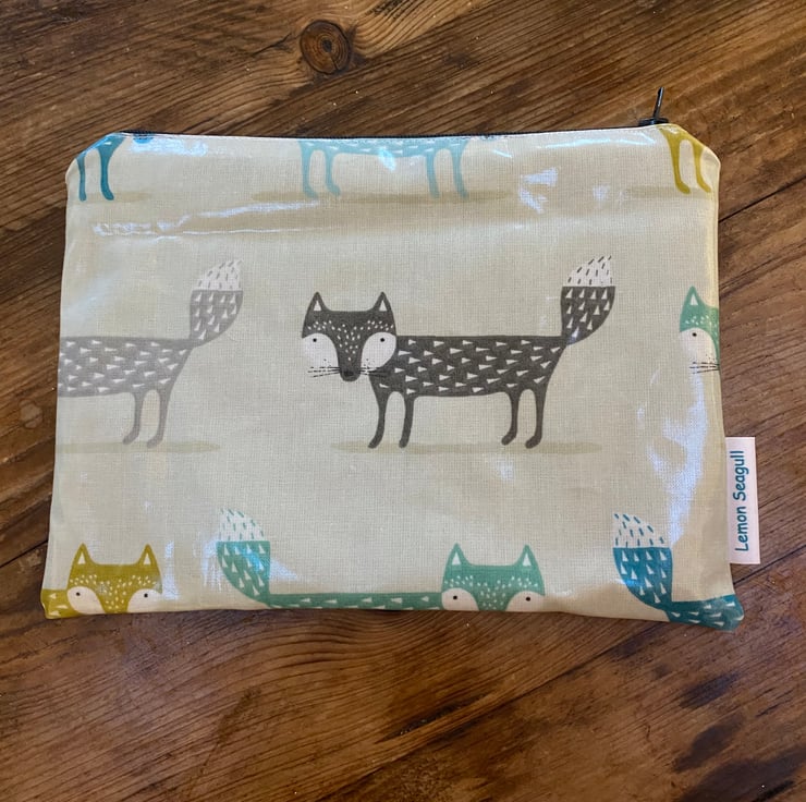This bag is made from grey oil cloth with coloured foxes. The bag is lined with a blue cotton fabric and a grey zip.