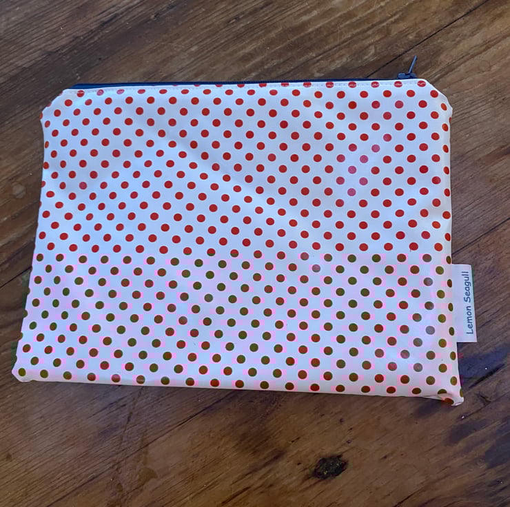 This bag is made from white oil cloth with red spots. The bag is lined with a red gingham cotton fabric and a blue zip.
