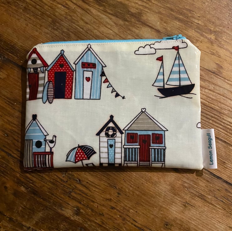 This make up bag is made from cream oil cloth with seaside design. The bag is lined with a blue cotton fabric and a blue zip.