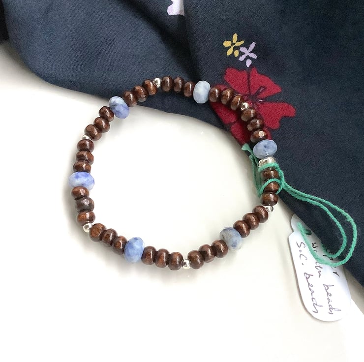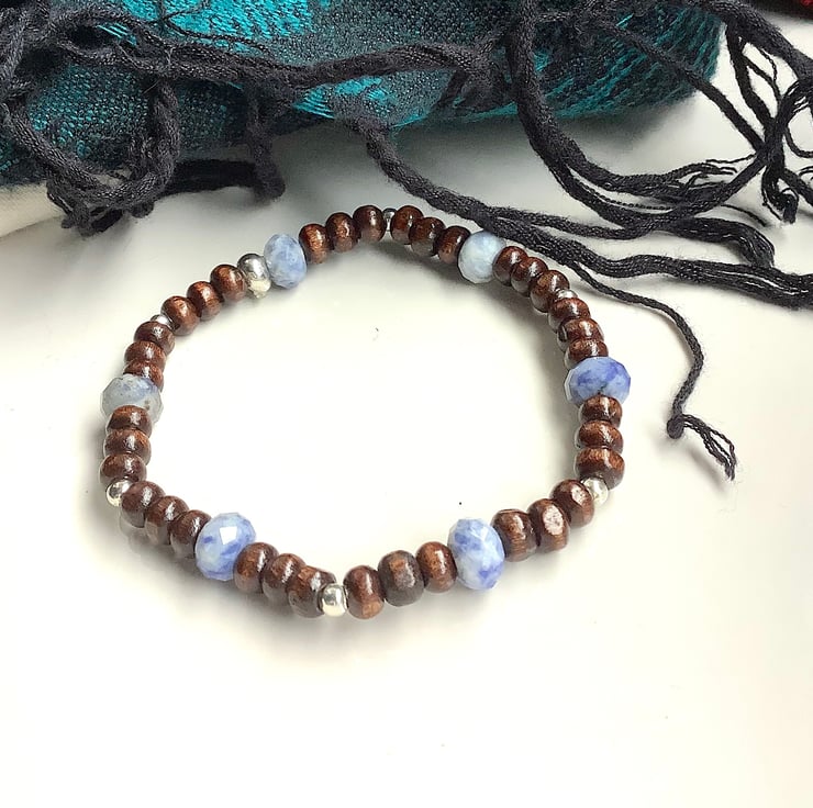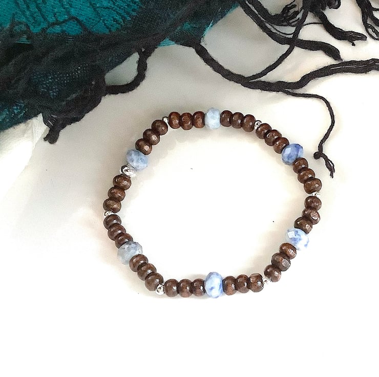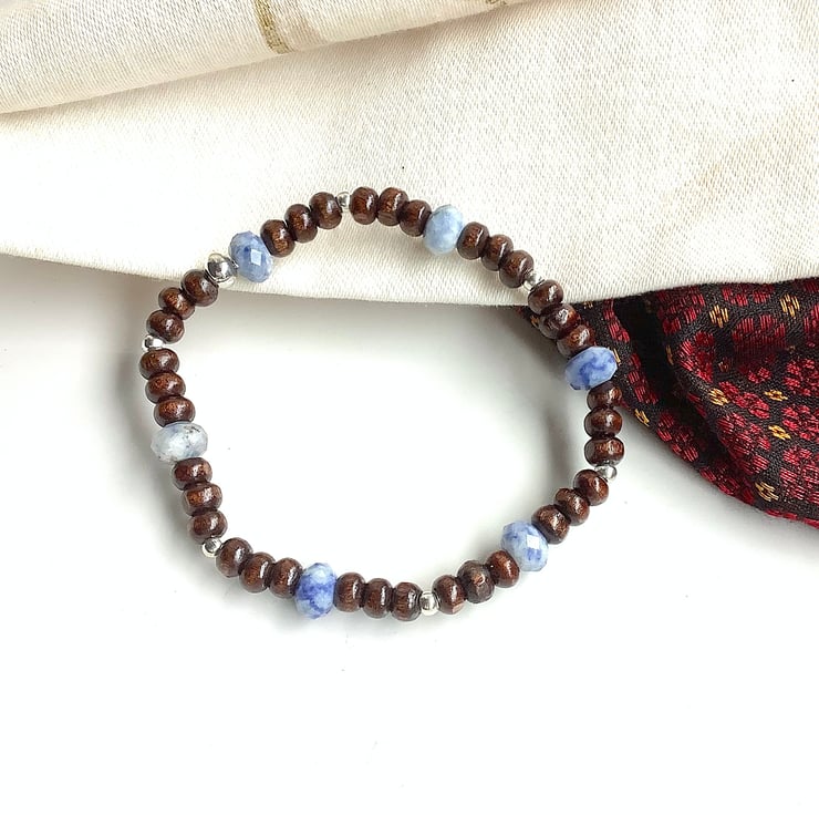 Earthy combination of wooden beads with Blue Jasper and silver coated beads bracelet