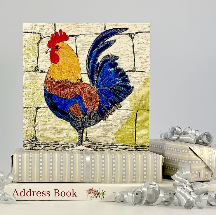 Easter Chicken card featuring a reproduction fo textile artist Heidi Meier's textile artwork of a Copper Maran standing proudly strutting its stuff! This chicken breed has gorgeous colours which work beautifully as n Easter card design and the original detail of the textile embroidery can still be seen.