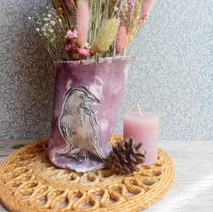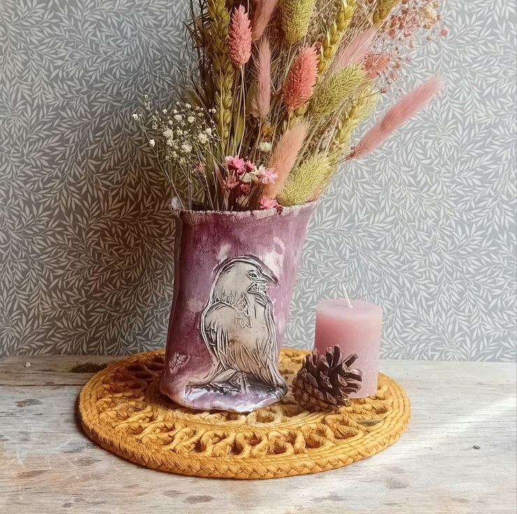 Handmade in earthenware clay, and imprinted with my crow linocut design and then highlighted to bring out the pattern, hand painted,glazed with a clear glaze to make it water proof. Approx 12cm-14cm tall