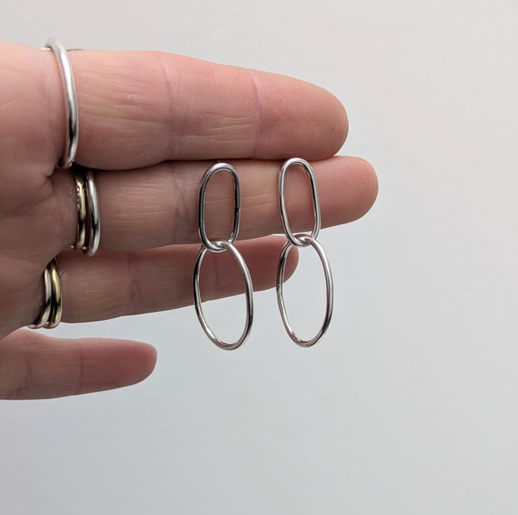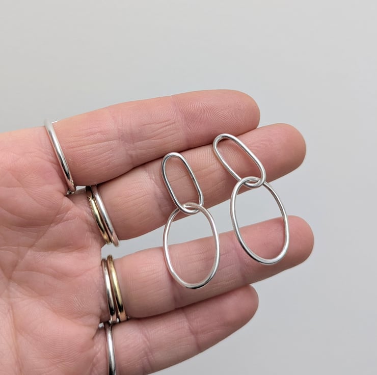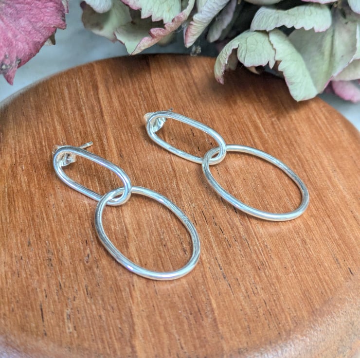 Dangly stud earrings featuring two connecting oval shapes. A minimalist design great for any occasion. Handmade in Sheffield using solid recycled sterling silver.