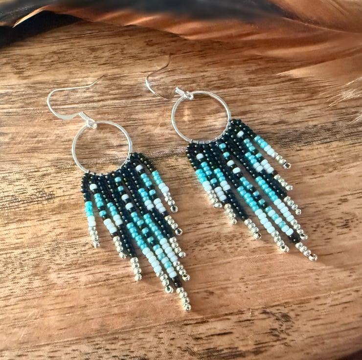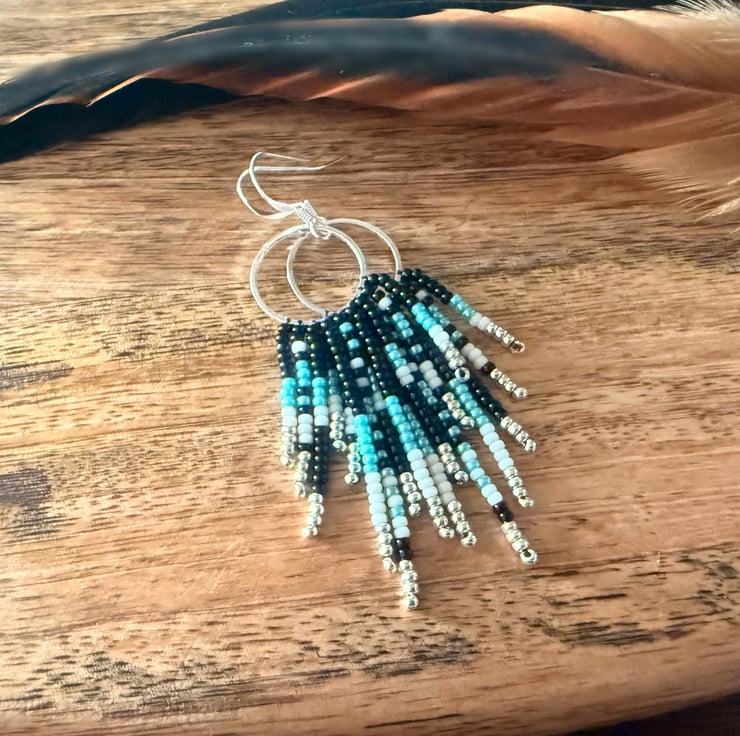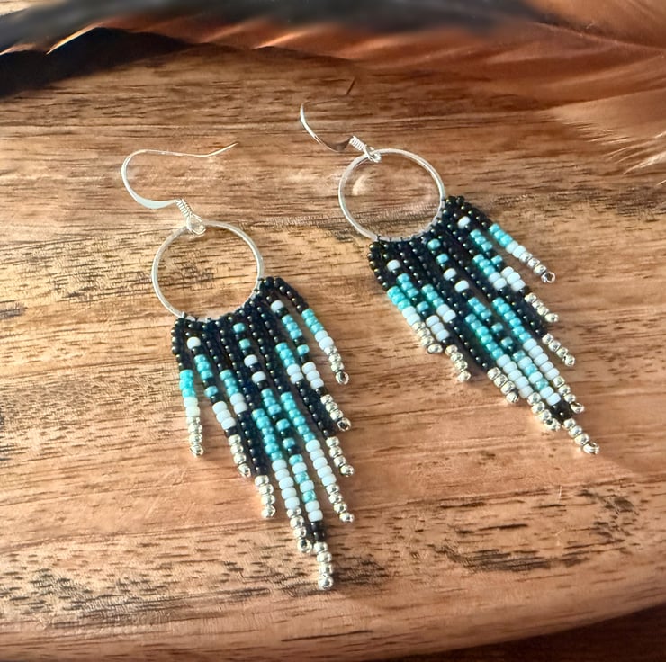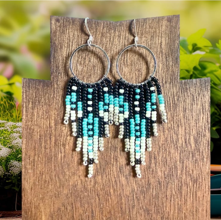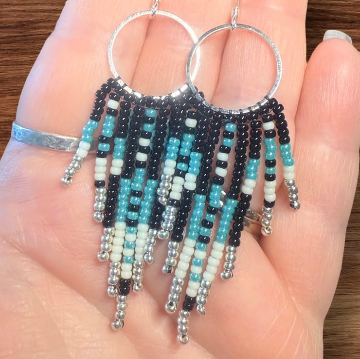 The small beads have been handwoven in a single row onto a silver tone hoop and a beaded fringe hangs from every row. The pattern of these earrings is a Native American tribal design created by me and the fringe has an ascending V length.