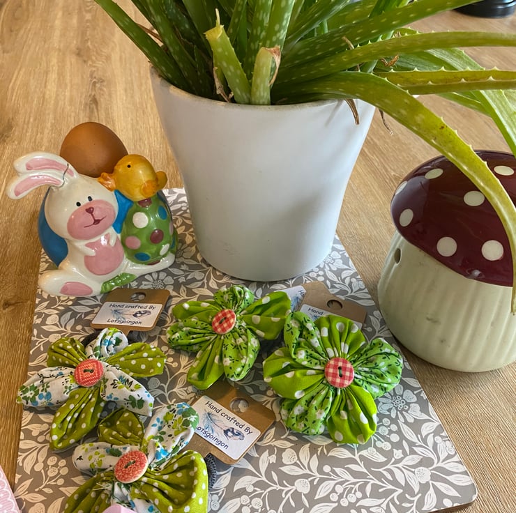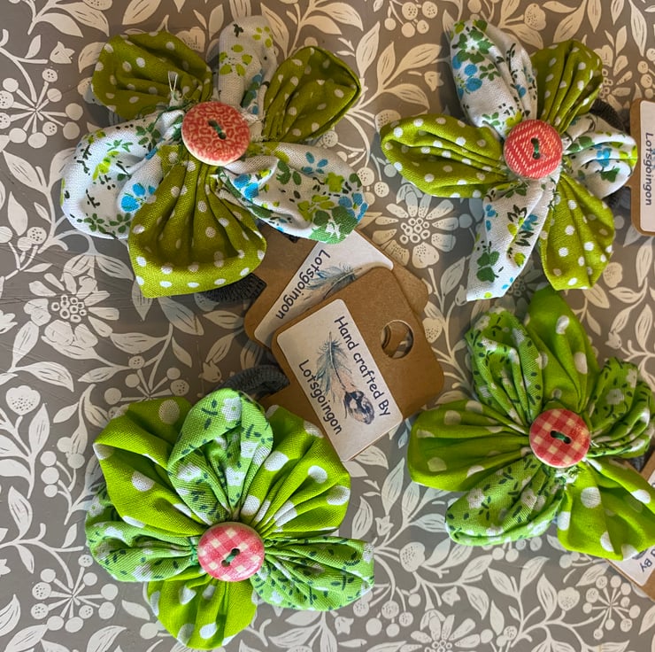 Beautiful hand stitched hair ties, spring/summer colours, finished with a lovely red coloured button in the centre.
