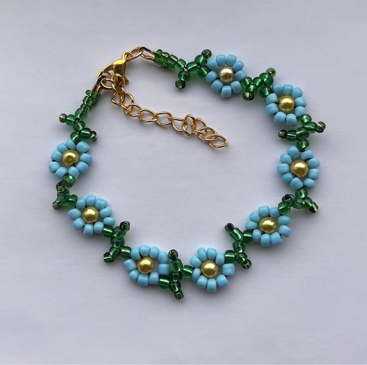 Golden Yellow glass pearl beads sit at centres of flowers