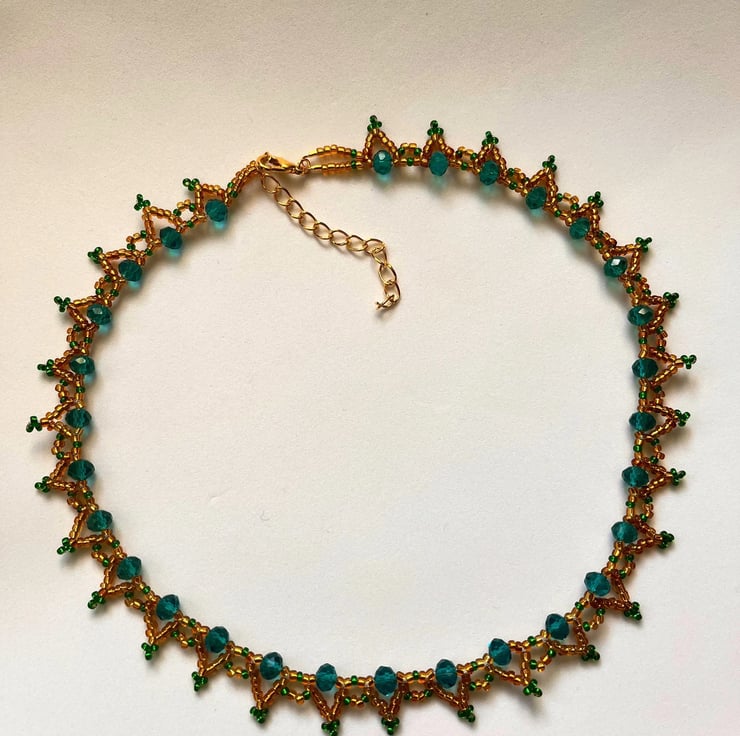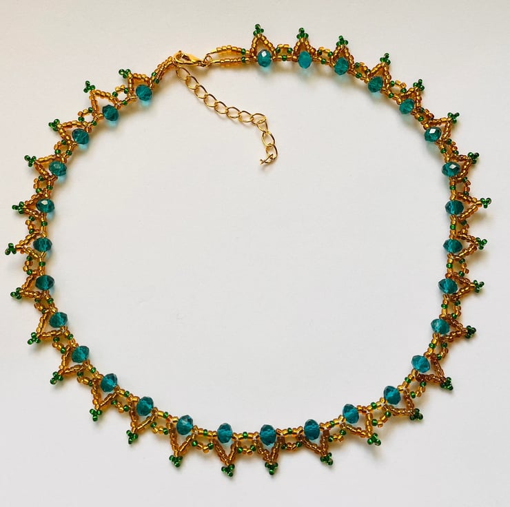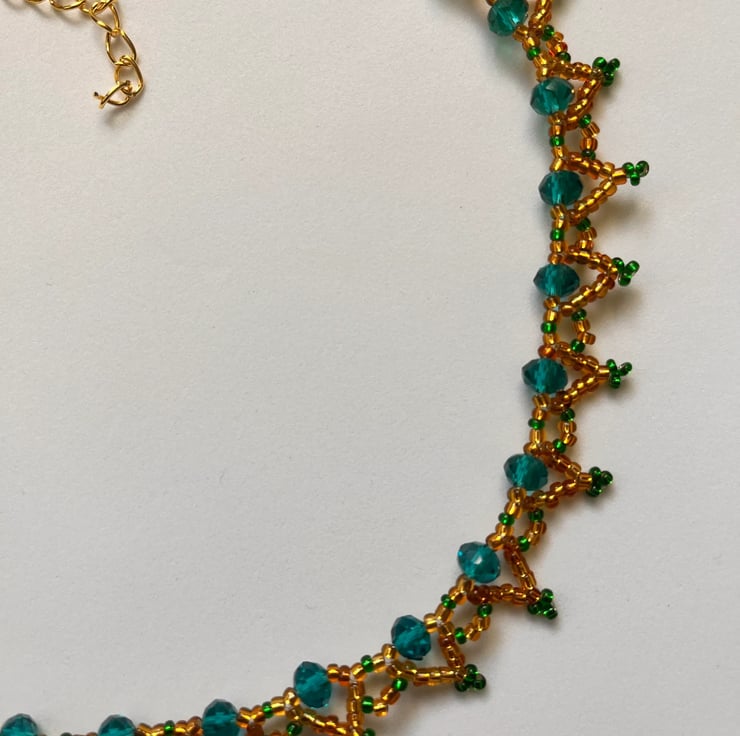 Crystal glass Bead NECKLACE art deco style Teal Green Golden glass 16" strand