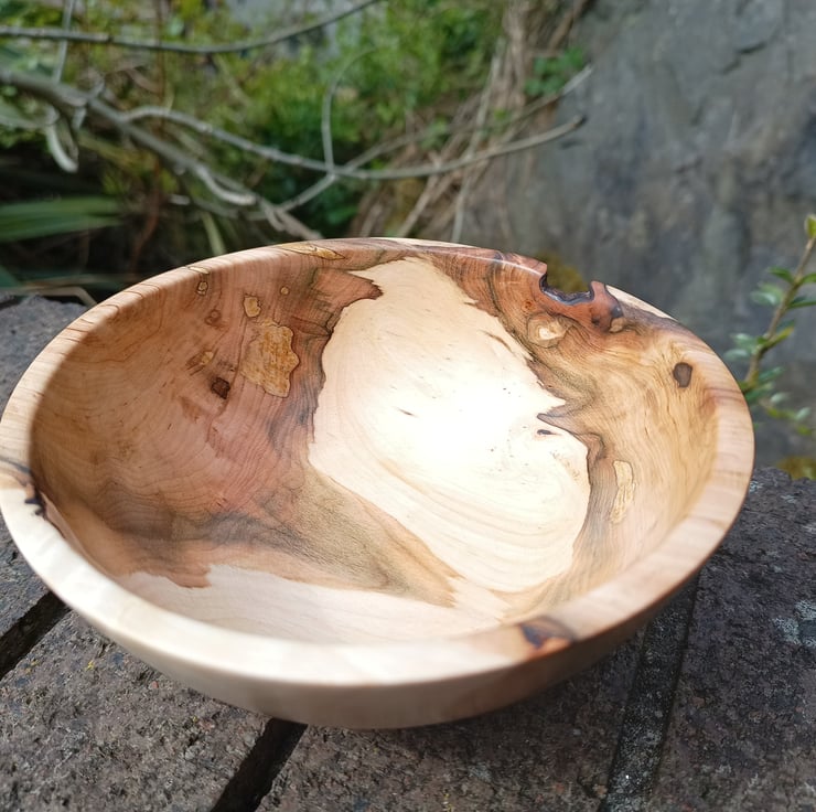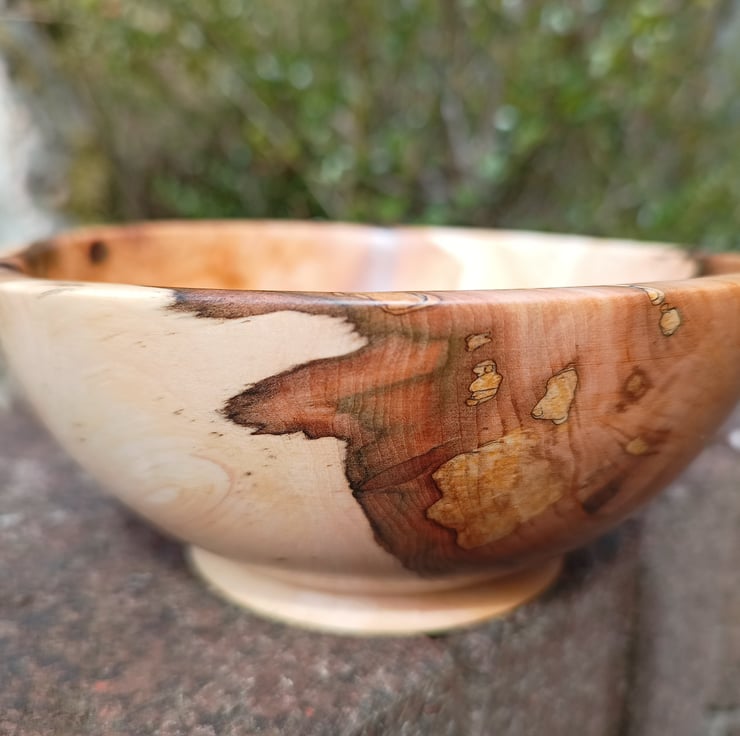 Spalted Rowan bowl with beautiful mix of colours and grain pattern and a small void on the rim. Finished with danish oil and wax. Size H 6cm W 16cm.